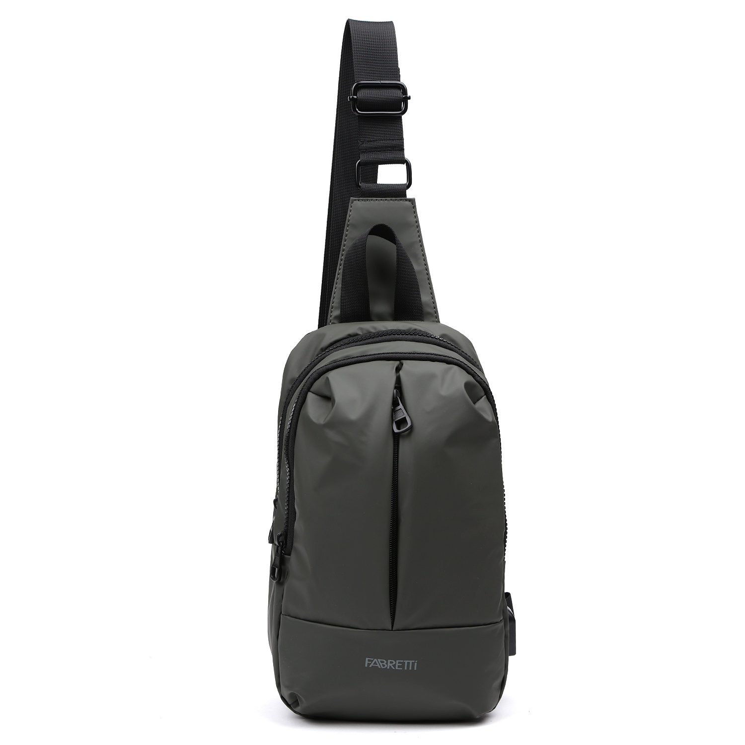 Cумка через плечо FABRETTI в оттенке хаки выполнена из влагостойкого гладкого нейлона. Модель имеет 2 отделения, каждое из которых закрывается на полукруглую молнию. Внутри основного отделения есть глубокий открытый боковой карман. На лицевой стороне изделия расположен вертикальный карман на молнии. Сбоку предусмотрен usb-порт. Спинка с системой циркуляции воздуха Air Flow имеет специальную рельефную поверхность, обеспечивает удобное прилегание к спине и вентиляцию. Сумку можно носить через плечо, а также на плече - переместив регулируемую по длине лямку. Аксессуар прекрасно подойдёт для прогулок по городу, велосипедных поездок или путешествий.