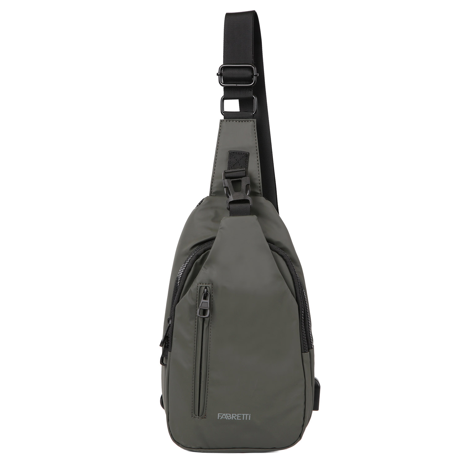 Cумка через плечо FABRETTI в цвете хаки выполнена из высокотехнологичного влагостойкого нейлона. Основное отделение закрывается на полукруглую молнию. Внутри 3 открытых боковых кармана. На лицевой стороне изделия расположены 3 кармана разного назначения: один на полукруглой молнии, другой – открытый и вертикальный карман быстрого доступа.  Сбоку предусмотрен usb-порт. Спинка с системой циркуляции воздуха Air Flow имеет специальную рельефную поверхность, обеспечивает удобное прилегание к спине и вентиляцию. Сумку можно носить через плечо, а также на плече - переместив регулируемую по длине лямку. Аксессуар прекрасно подойдёт для прогулок по городу, велосипедных поездок или путешествий. Выполненный в стиле унисекс, подходит как мужчинам, так и женщинам.