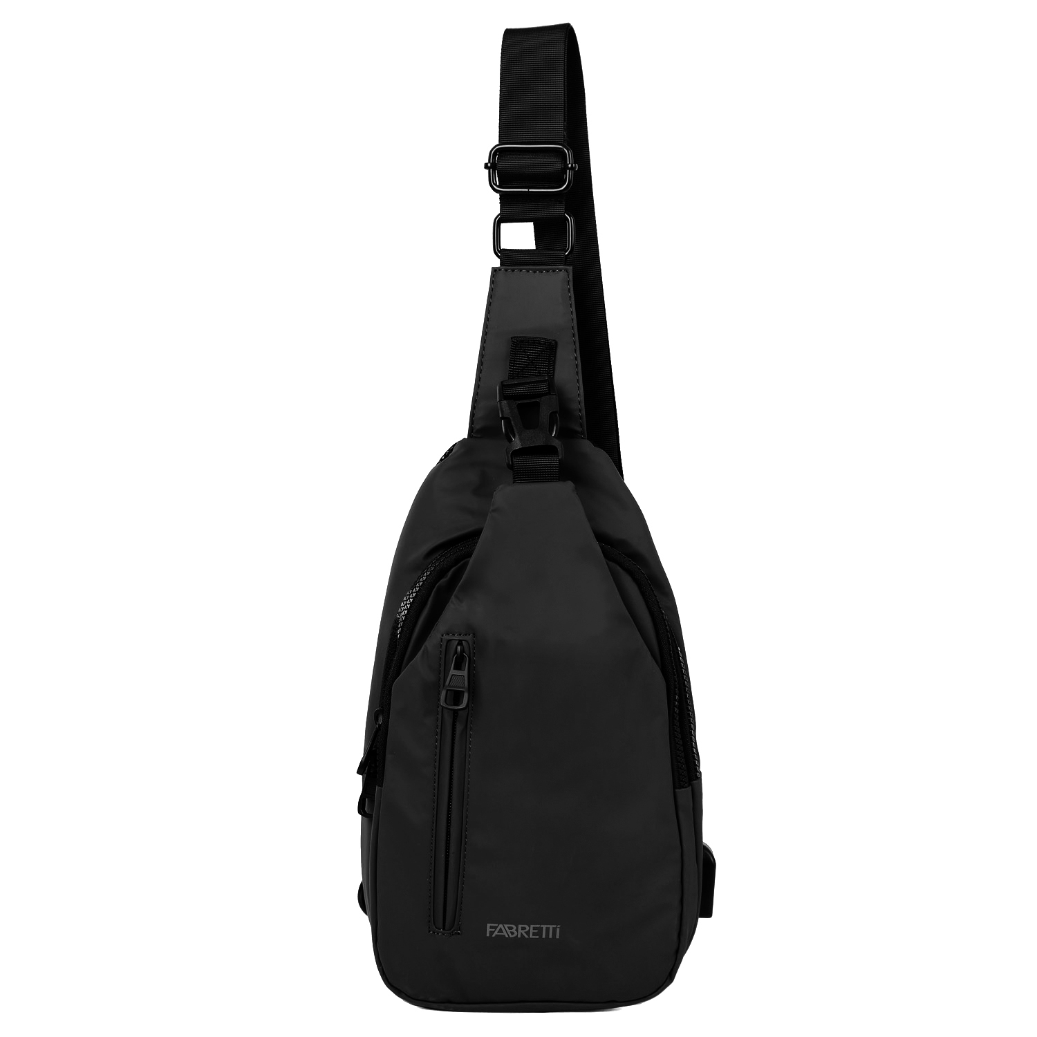 Cумка через плечо FABRETTI в черном цвете выполнена из высокотехнологичного влагостойкого нейлона. Основное отделение закрывается на полукруглую молнию. Внутри 3 открытых боковых кармана. На лицевой стороне изделия расположены 3 кармана разного назначения: один на полукруглой молнии, другой – открытый и вертикальный карман быстрого доступа.  Сбоку предусмотрен usb-порт. Спинка с системой циркуляции воздуха Air Flow имеет специальную рельефную поверхность, обеспечивает удобное прилегание к спине и вентиляцию. Сумку можно носить через плечо, а также на плече - переместив регулируемую по длине лямку. Аксессуар прекрасно подойдёт для прогулок по городу, велосипедных поездок или путешествий. Выполненный в стиле унисекс, подходит как мужчинам, так и женщинам.