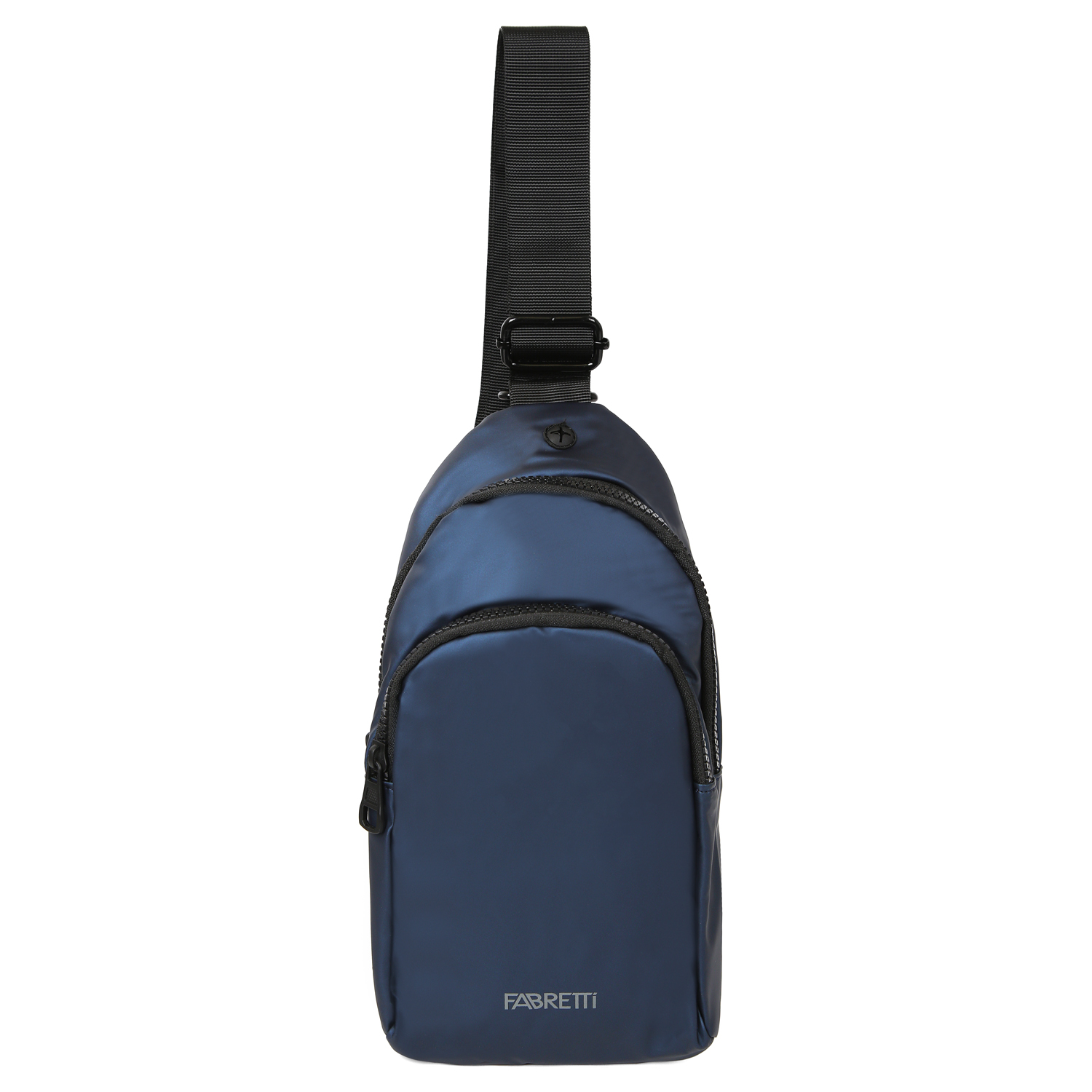 Cумка через плечо FABRETTI в темно-синем оттенке выполнена из влагостойкого гладкого нейлона. Основное отделение закрывается на полукруглую молнию. Внутри есть боковой карман на молнии. В верхней части предусмотрен разъем для проводных наушников. На лицевой стороне изделия расположен вместительный карман на молнии. На тыльной стороне есть потайной открытый карман на липучке. Сумку можно носить через плечо, а также на плече - переместив регулируемую по длине лямку. Сумка прекрасно подойдёт для прогулок по городу, велосипедных поездок или путешествий.