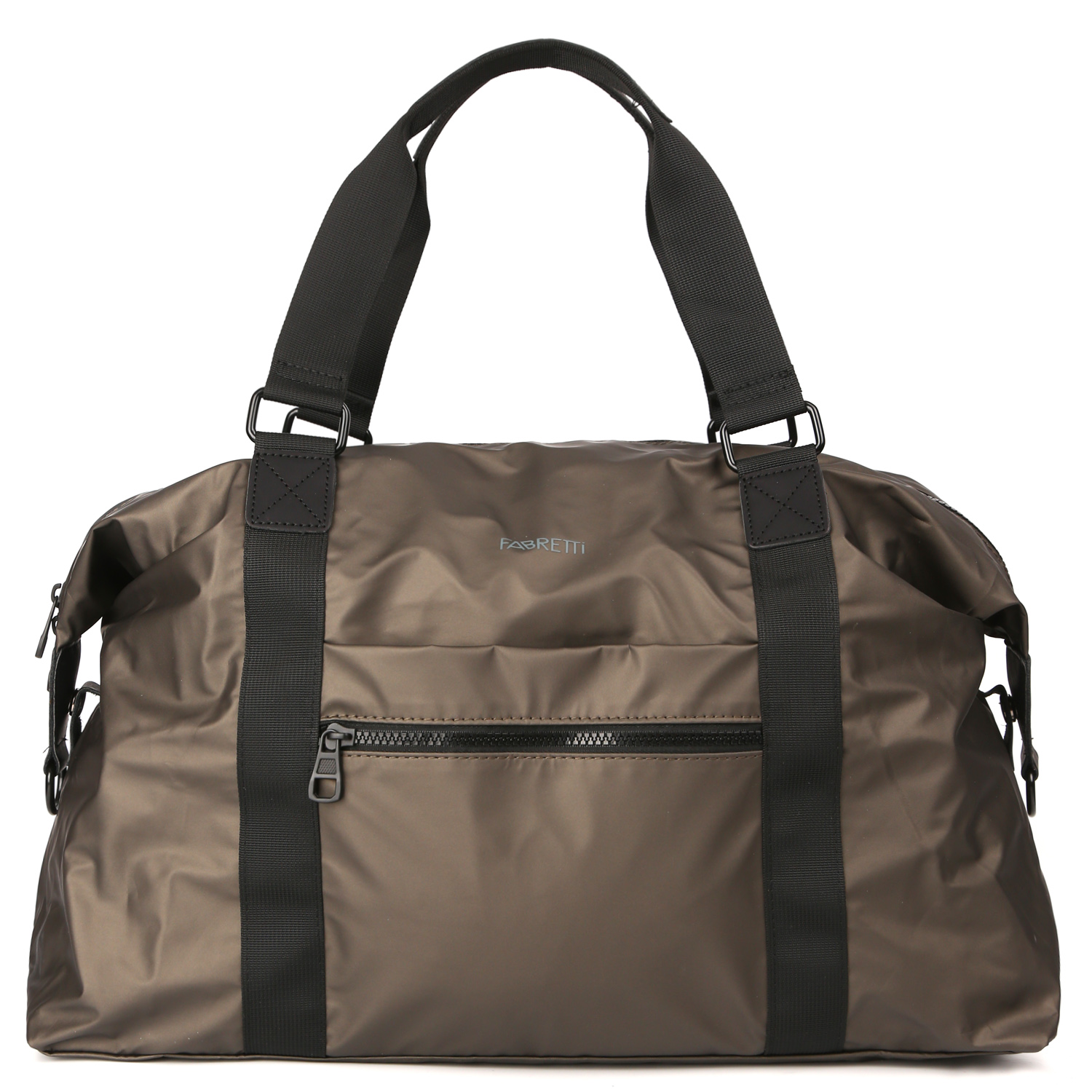 Текстильная сумка FABRETTI в серо-коричневом оттенке выполнена из влагостойкого гладкого нейлона. Он практичен и прост в уходе. Основное отделение закрывается на молнию с 2 бегунками. Внутри 3 боковых кармана: 2 открытых и на молнии. На лицевой стороне расположены 2 вместительных кармана: открытый и на молнии. На тыльной стороне предусмотрен карман быстрого доступа на молнии и специальный рукав для крепления на ручку чемодана. В комплект входит съемный плечевой ремень, длина которого регулируется.  Сумка станет незаменимой в поездках, при походе в спортзал или бассейн.