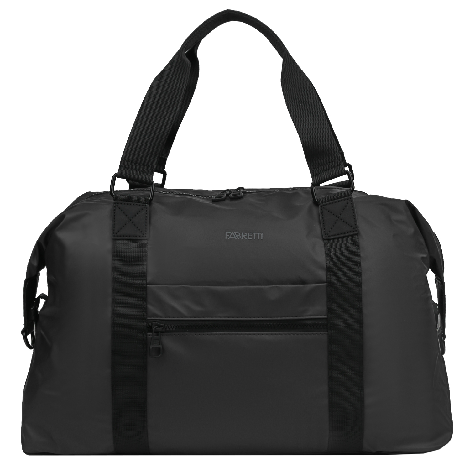 Текстильная сумка FABRETTI в сером цвете выполнена из влагостойкого гладкого нейлона. Он практичен и прост в уходе. Основное отделение закрывается на молнию с 2 бегунками. Внутри 3 боковых кармана: 2 открытых и на молнии. На лицевой стороне расположены 2 вместительных кармана: открытый и на молнии. На тыльной стороне предусмотрен карман быстрого доступа на молнии и специальный рукав для крепления на ручку чемодана. В комплект входит съемный плечевой ремень, длина которого регулируется.  Сумка станет незаменимой в поездках, при походе в спортзал или бассейн.