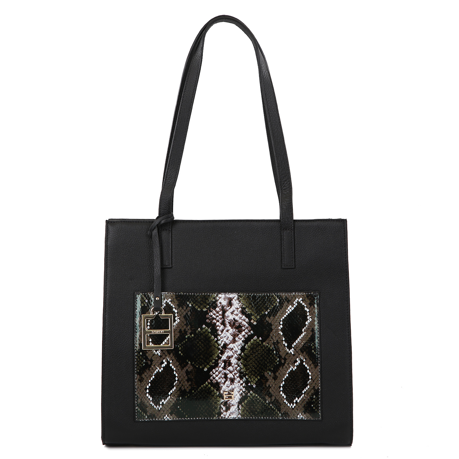 Стильный шоппер FABRETTI в черном цвете выполнен из натуральной зернистой кожи и на лицевой стороне декорирована карманом с тиснением под рептилию. Сумка имеет жесткий каркас и закрывается на молнию с кожаным поводком. Внутри 3 кармана быстрого доступа: 2 открытых и на молнии. На тыльной стороне предусмотрен карман быстрого доступа на молнии. Дно сумки защищают 4 металлические ножки. Две удлиненные ручки позволяют комфортно носить аксессуар на плече. Модель вмещает формат А4. Цвет фурнитуры - золото.