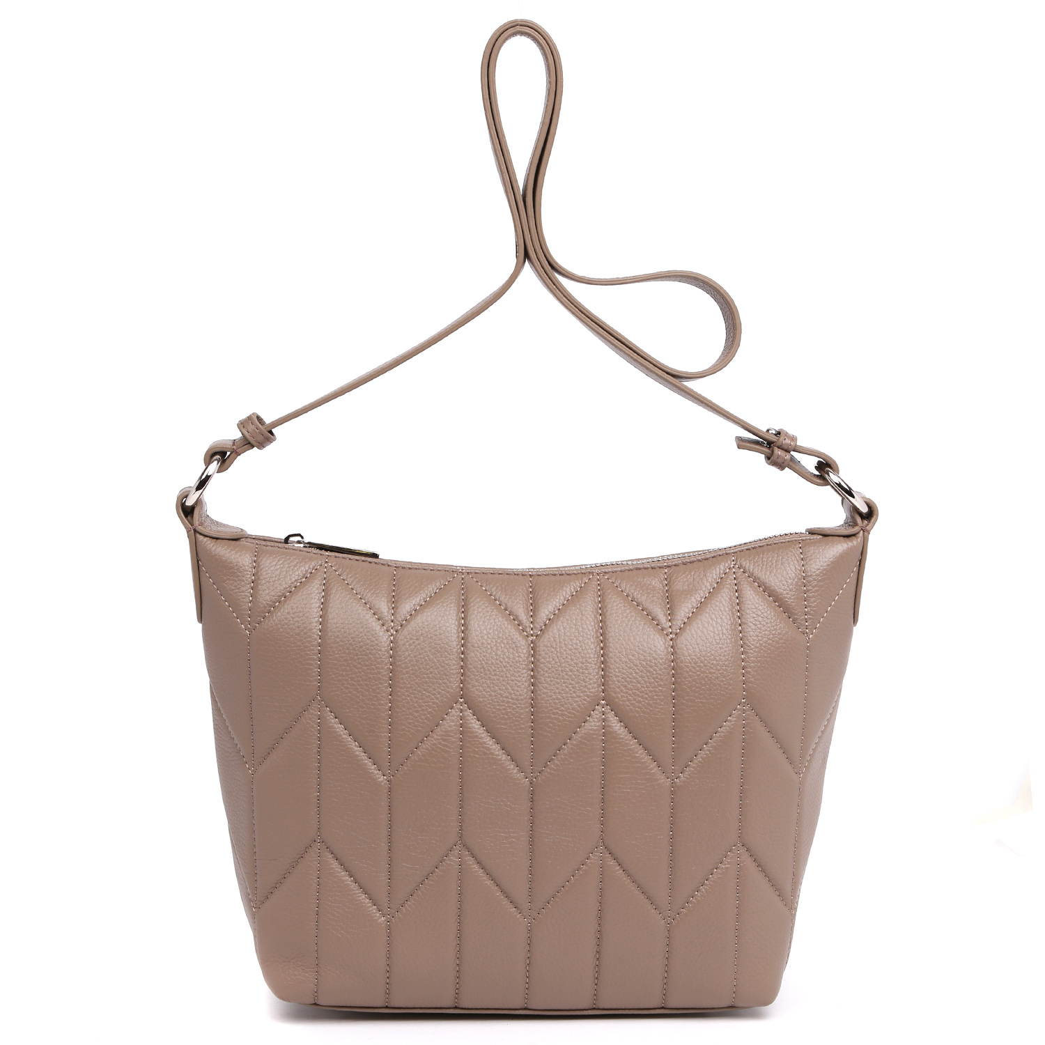 Сумка-хобо PALIO выполнена из натуральной зернистой кожи в темно-бежевом оттенке и декорирована геометрической стёжкой. Основное отделение закрывается на молнию. Внутри есть 2 боковых кармана: открытый и на молнии. Плечевой ремень регулируется по длине, что позволяет комфортно носить сумку на плече или в руке. Дно сумки защищают 4 металлические ножки.