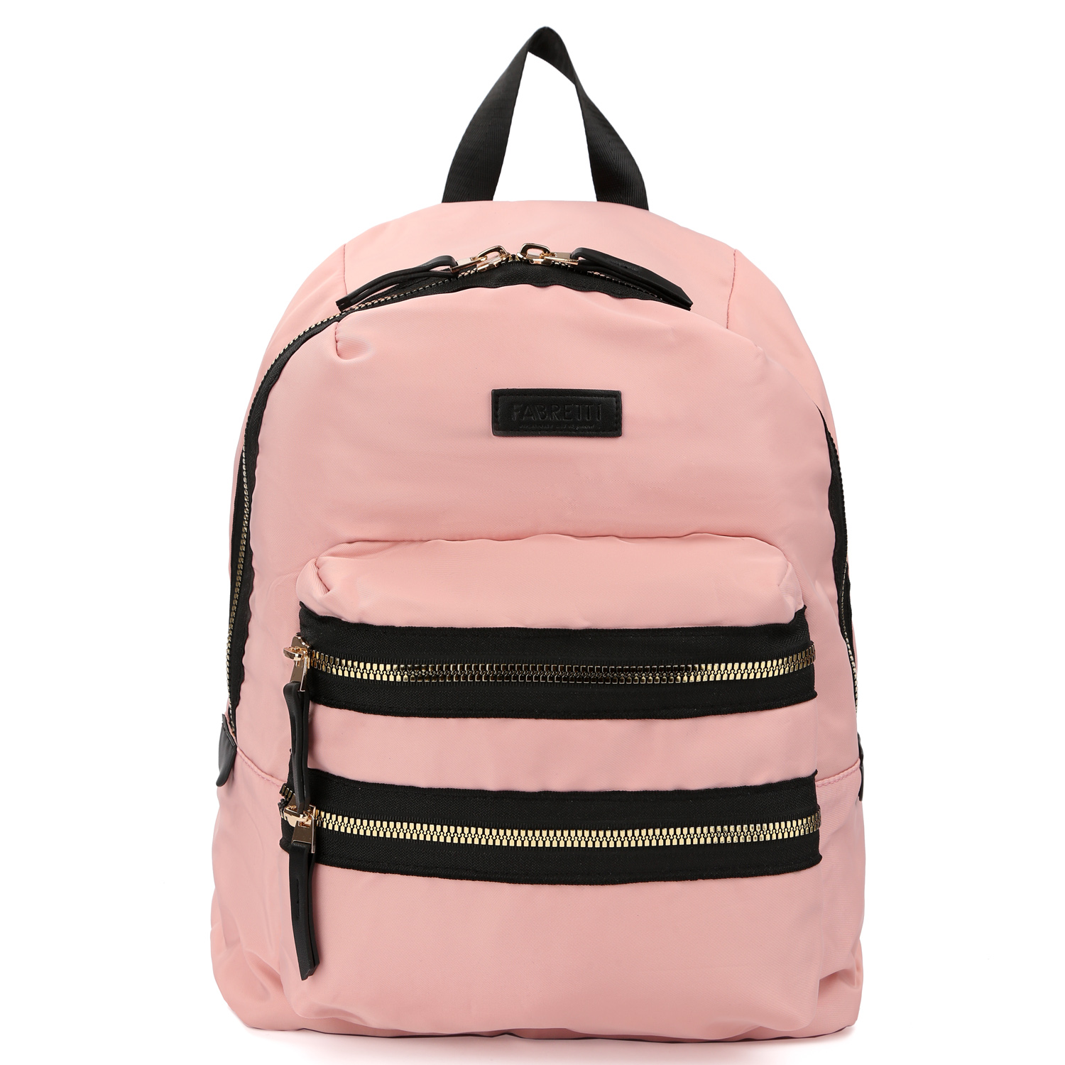 Текстильный рюкзак FABRETTI в светло-розовом оттенке идеально подойдет тем, кто ведет активный образ жизни, учится и предпочитает путешествовать налегке. Он достаточно вместителен, чтобы в него вошла любимая книга, документы, гаджеты, необходимая одежда, гигиенические аксессуары. Материал рюкзака устойчив к влаге, за ним удобно ухаживать. На лицевой стороне модели расположены 2 кармана на молнии - глубокий и небольшой. Основное отделение закрывается на молнию с 2 бегунками. Внутри - карман для мелочей на молнии и боковой отдел для планшета или документов. Мягкие плотные лямки регулируются по длине. Уплотненная спинка дарит дополнительный комфорт во время использования. Сверху есть ручка, чтобы носить в руке. Вмещает формат А4. Цвет фурнитуры - золото.