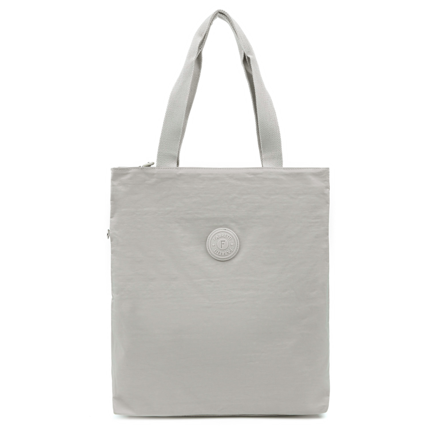Текстильная сумка FABRETTI в светло-сером оттенке выполнена из высокотехнологичного влагостойкого полиэстера легкой жатой фактуры. Он практичен и прост в уходе. Основное отделение закрывается на молнию с удобным поводком. Внутри 2 боковых кармана и секция с мягкой стенкой на хлястике с липучкой для гаджетов. Для удобства хранения ключей внутри сумки есть карабин на шнурке.  На тыльной стороне предусмотрен карман быстрого доступа на молнии. Удлиненные ручки (ширина - 3 см) позволяют удобно носить аксессуар в руке или на плече. Модель вмещает формат А4.