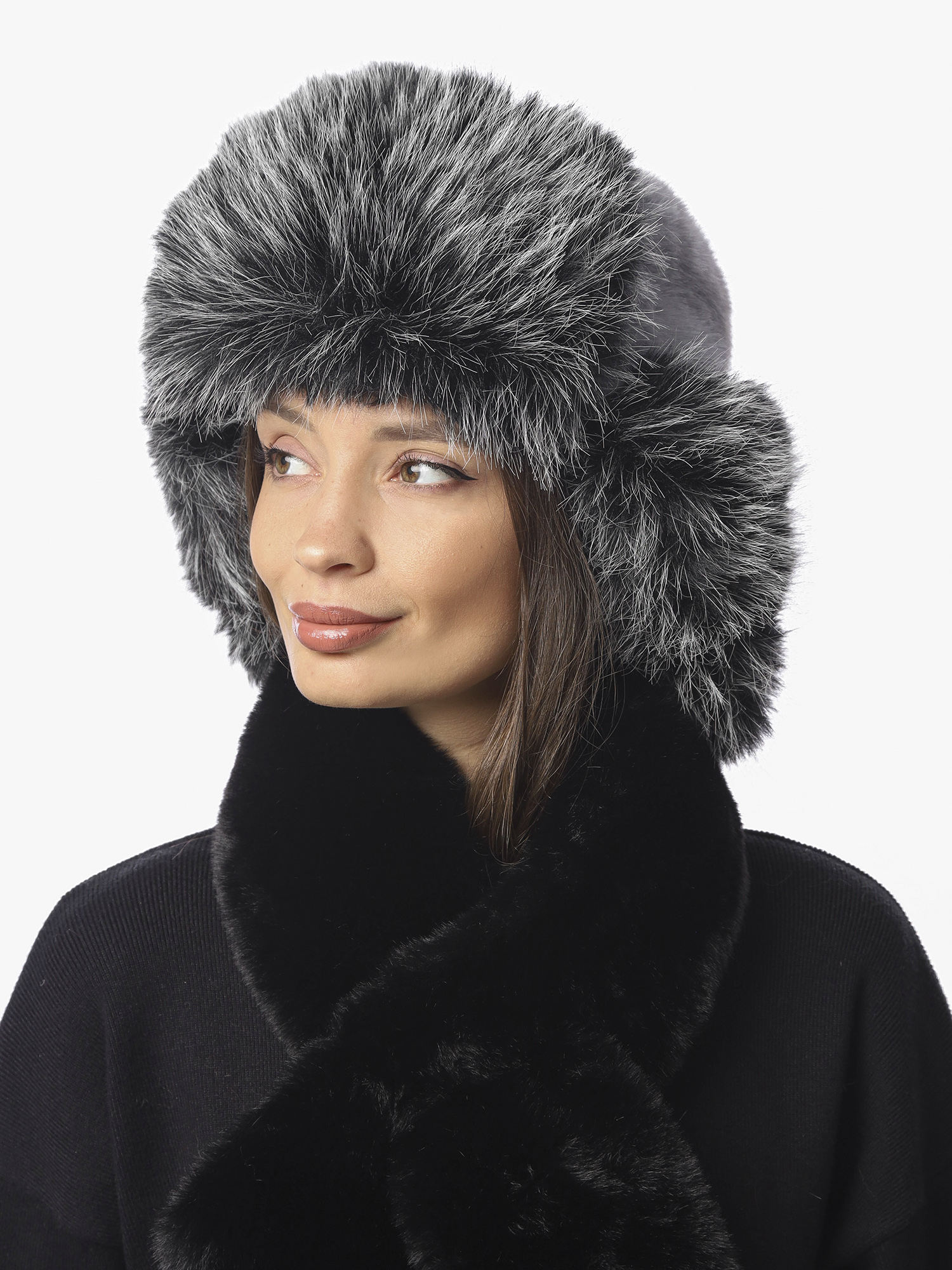 Шапка дополнена специальным ремешком, который может фиксироваться в трех положениях: сзади, под подбородком или вы можете носить шапку с расстегнутыми ушками.  Верх ушанки выполнен из светло-серого экомеха «под кролика», а отворот и ушки – из пушистого двухцветного экомеха «под песца».