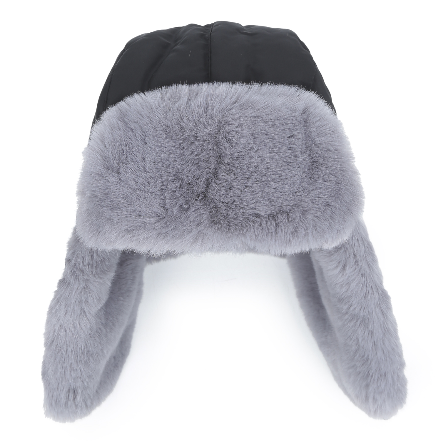 Шапка дополнена специальным ремешком, который может фиксироваться в трех положениях: сзади, под подбородком или вы можете носить шапку с расстегнутыми ушками.  Верхняя часть шапки выполнена из плащевой ткани черного цвета, а отворот и ушки – из пушистого серого экомеха «под кролика».