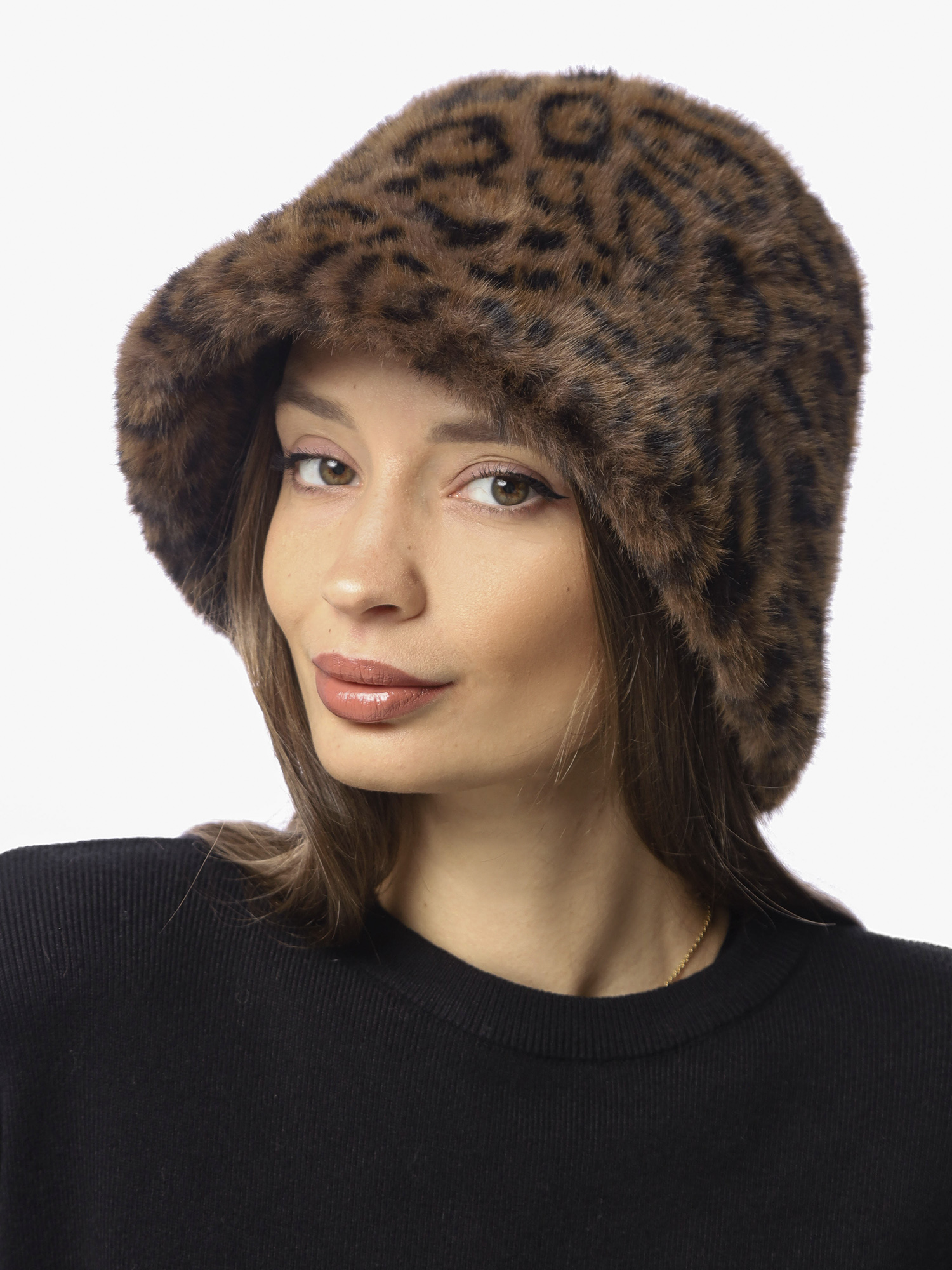 Женская панама FABRETTI из нежного экомеха норки трендового леопардового окраса. Теплая, уютная, приятная на ощупь, эта панама идеально подходит для холодного сезона.