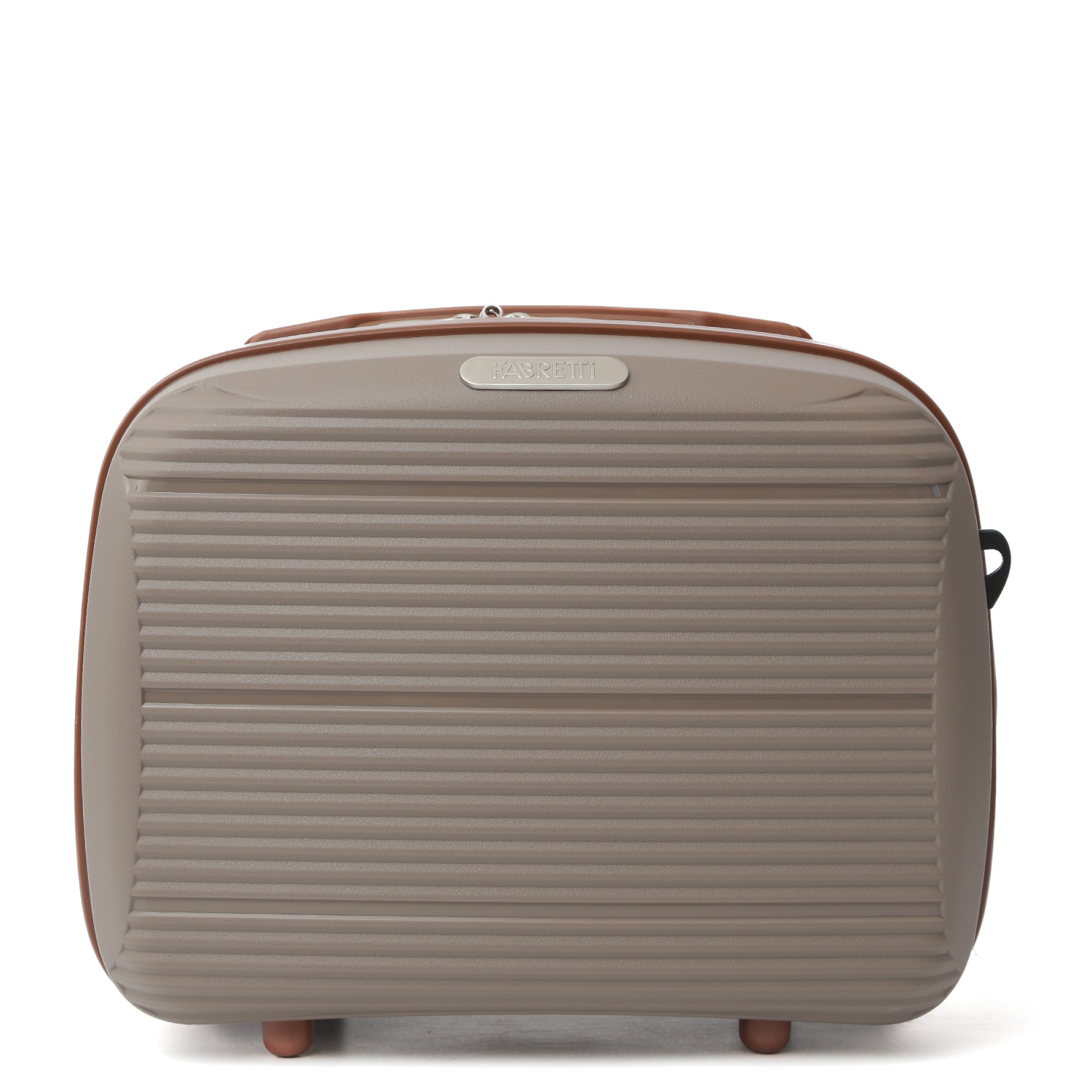 Бьюти-кейс FABRETTI выполнен из полипропилена - современного материала, для которого характерны высокая ударопрочность, стойкость к перепадам температур, отличная износостойкость. Основной бежево-серый оттенок подчеркнут коричневым в деталях аксессуара. Основное отделение закрывается на полукруглую молнию с двумя бегунками и имеет «ушки» для навесного замка (замок в комплект не входит). Внутри 3 боковых кармана для мелочей: 2 открытые с фиксирующими резинками и один на молнии. Текстильные ограничители на липучках. На тыльной стороне предусмотрена резинка, позволяющая крепить аксессуар на ручку чемодана.  Сверху есть ручка. Дно аксессуара защищают 4 ножки. В комплекте есть съемный плечевой ремень с резиновой плечевой накладкой (ширина - 3,5 см, длина - 115 см).