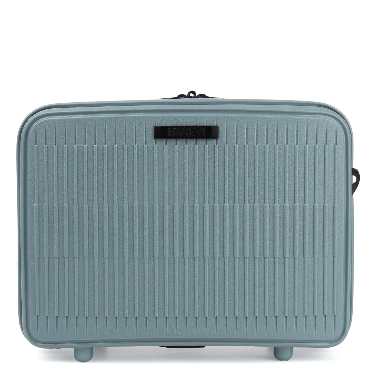 Бьюти-кейс итальянского бренда FABRETTI серо-голубого оттенка выполнен из полипропилена - современного материала, для которого характерны высокая ударопрочность, стойкость к перепадам температур, отличная износостойкость.