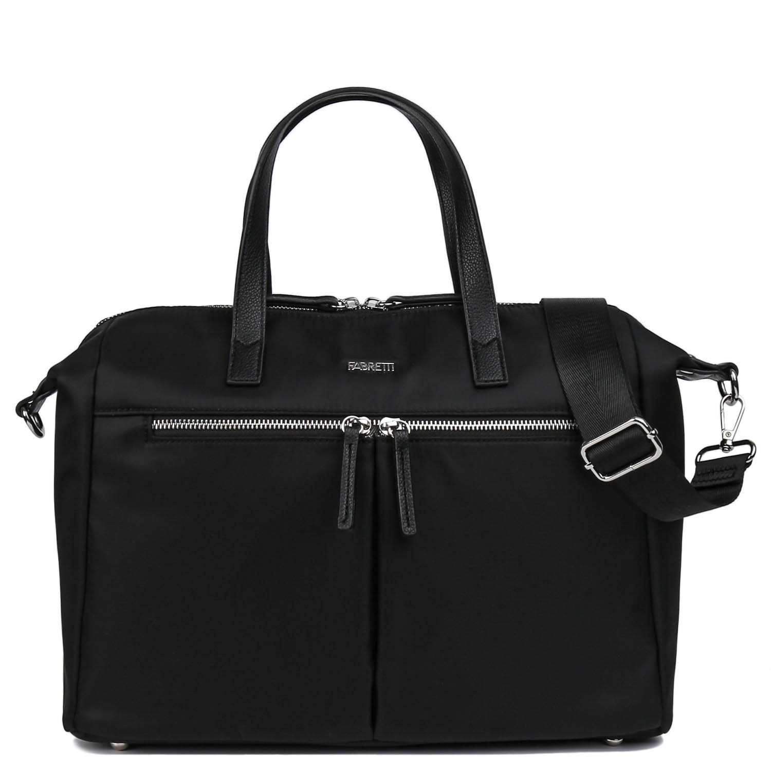 Текстильная сумка FABRETTI в черном цвете выполнена из высококачественного нейлона, устойчивого к воздействию влаги. Ручки и элементы декора - из экокожи. Просторное отделение закрывается на молнию с 2 бегунками. Внутри карман на молнии для мелочей и секция с мягкой стенкой для гаджетов. На лицевой стороне расположены 2 кармана на молнии, гаронично вписанные в дизайн изделия. На тыльной стороне предусмотрен карман быстрого доступа на молнии. Ручки позволяют комфортно носить аксессуар в руке. Дно сумки защищают 4 металлические ножки. Съемный плечевой ремень регулируется по длине, ширина - 4 см. Вмещает формат А4. Цвет фурнитуры - серебро.