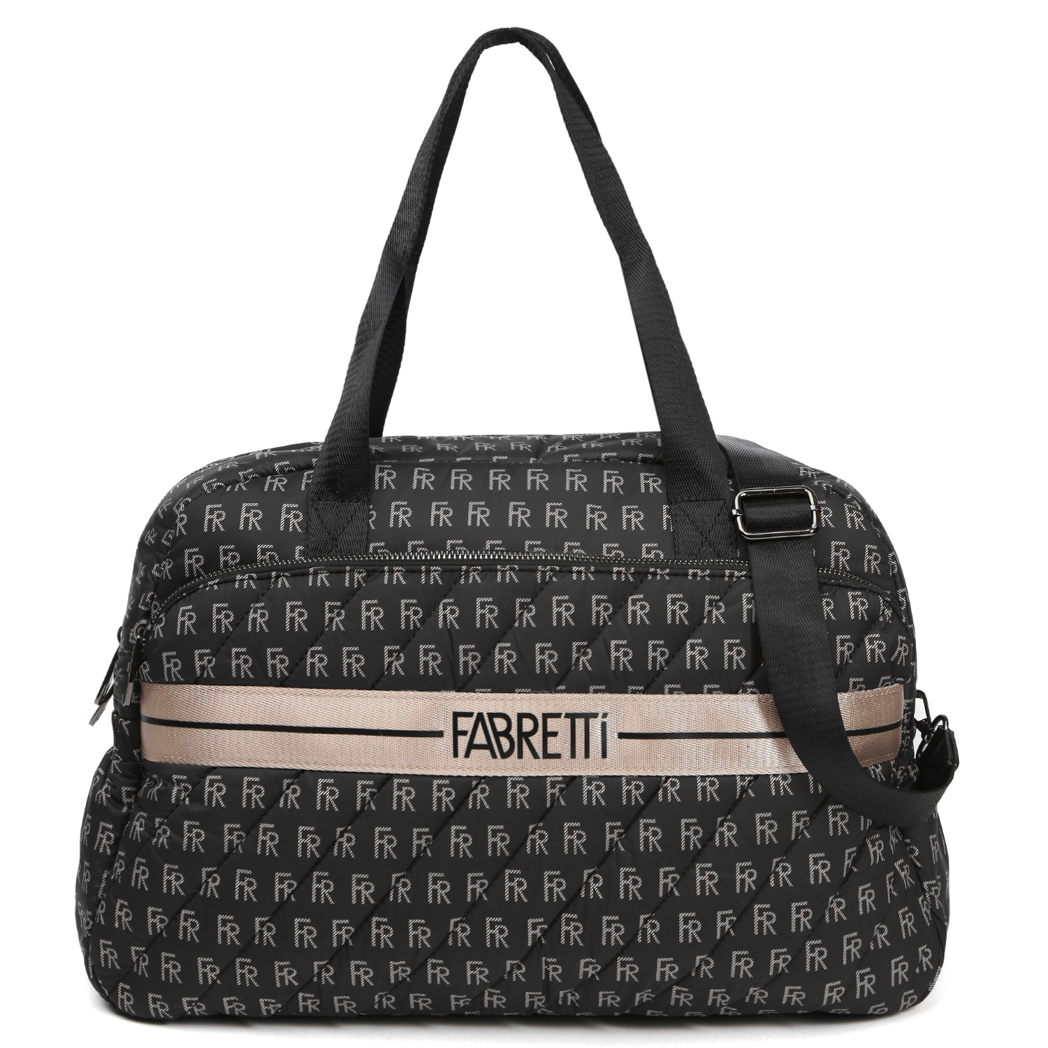 Вместительная текстильная сумка FABRETTI в черном цвете и стильным принтом в стиле «Логомания» выполнена из высокотехнологичного полиэстера, устойчивого к воздействию влаги и перепаду температур. Основное отделение закрывается на полукруглую молнию с 2 бегунками. Внутри 3 кармана для мелочей: 2 открытых и на молнии. На лицевой стороне расположен накладной карман на полукруглой молнии, декорированный диагональной стёжкой и широкой стропой в бежевом оттенке с надписью FABRETTI. На тыльной стороне предусмотрен карман быстрого доступа на молнии. По бокам расположены открыты карманы на резинке. Дно сумки и элементы декора выполнены из экокожи. Две текстильные ручки позволяют комфортно носить аксессуар в руке. Текстильный плечевой ремень съемный, регулируется по длине, ширина - 3 см. Цвет фурнитуры - черненый никель.