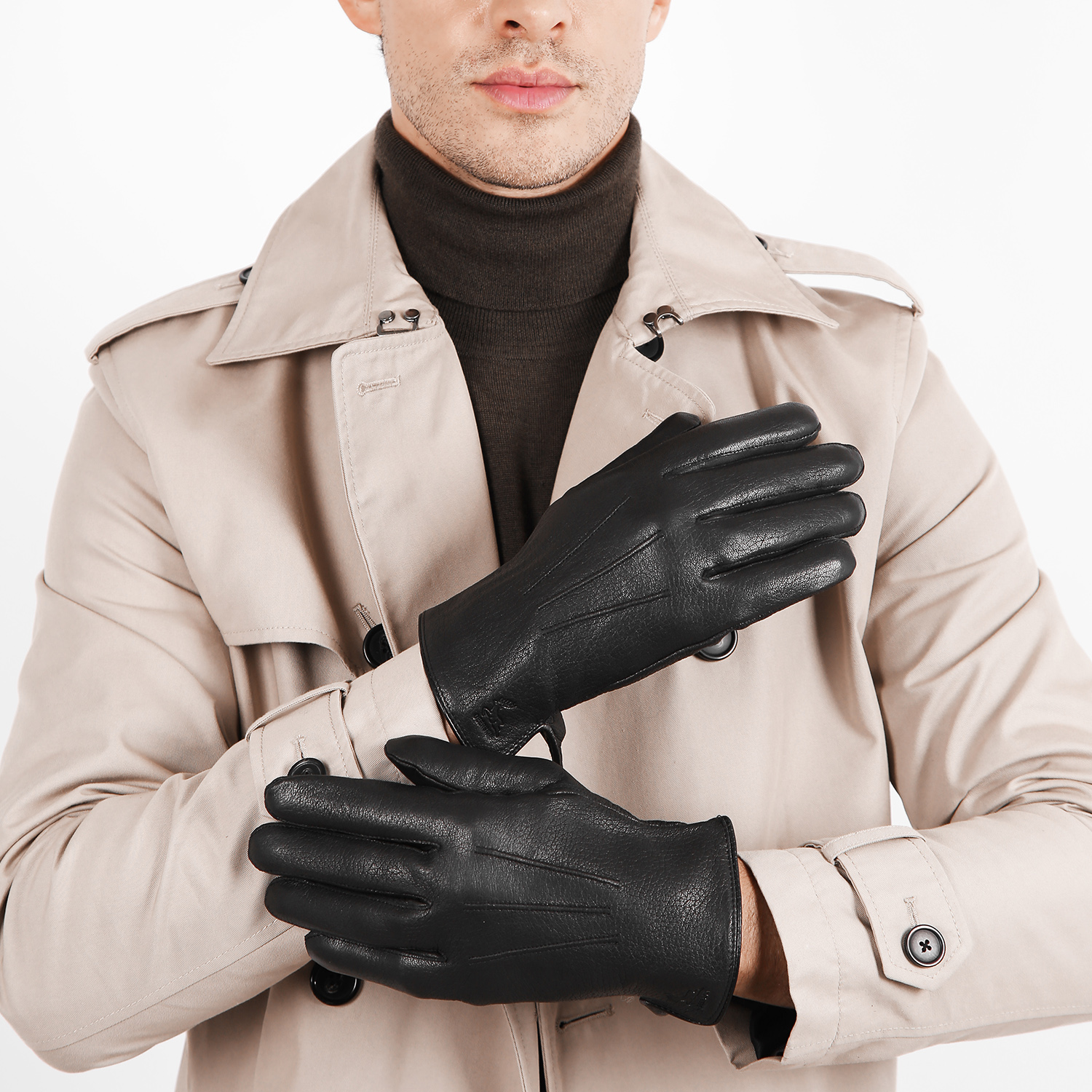 Классические мужские перчатки FABRETTI в черном цвете выполнены из натуральной кожи оленя. Лицевая сторона декорирована строчкой в виде 3 лучей. Резинка на внутренней стороне манжеты и шлица на боковой стороне обеспечивают удобное расположение модели на запястье. Подкладка из шерсти позволит рукам оставаться в тепле в холодный сезон. Прекрасный вариант для межсезонья и европейской зимы.
