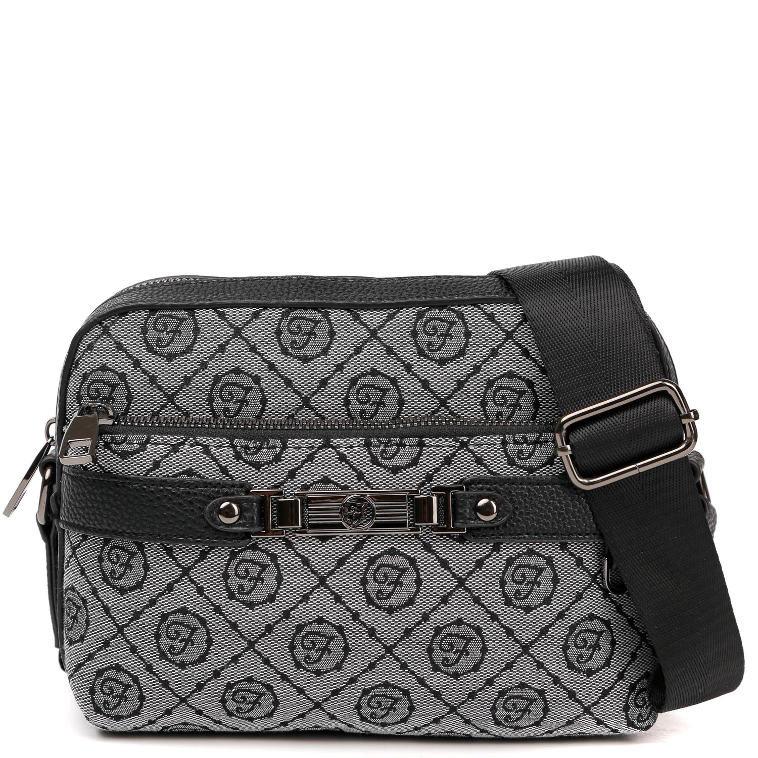 Стильная сумка через плечо FABRETTI в черном цвете декорирована узором в стиле «Логомания». Сумка выполнена из высокотехнологичного полиэстера с фактурой гобелен, устойчивого к воздействию влаги и перепаду температур. Дно изделия и детали отделки – из экокожи. Сумка закрывается на полукруглую молнию. Внутри 2 кармана для мелочей: открытый и на молнии. На лицевой стороне расположен карман на молнии, на тыльной стороне также есть карман быстрого доступа на молнии. Текстильный плечевой ремень регулируется по длине, ширина - около 4 см. Цвет фурнитуры - черненый никель.