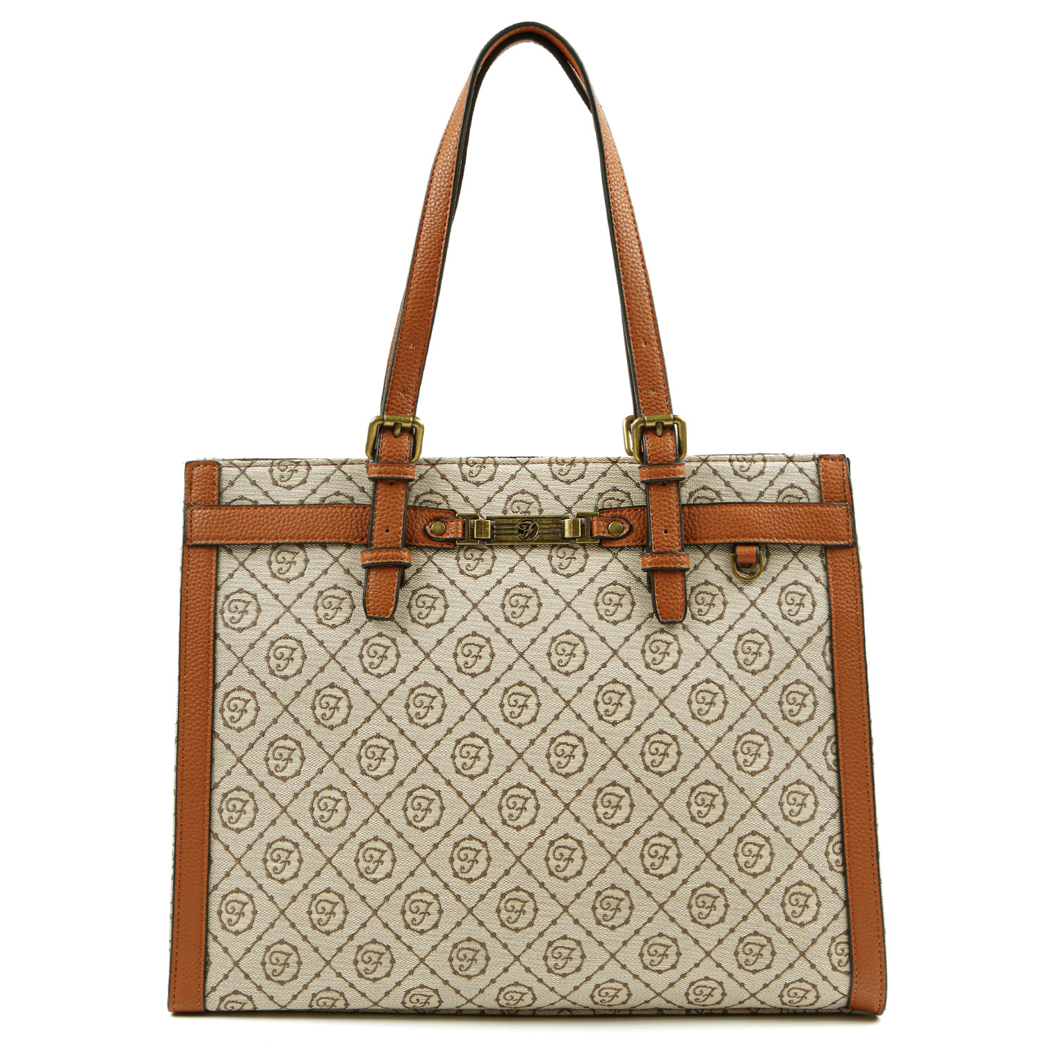 Вместительная сумка-тоут FABRETTI в светло-коричневом оттенке декорирована узором в стиле «Логомания». Сумка выполнена из высокотехнологичного полиэстера с фактурой гобелен, устойчивого к воздействию влаги и перепаду температур. Ручки и детали отделки – из экокожи. Сумка закрывается на молнию. Внутри есть 3 кармана для мелочей: 2 открытых и на молнии. На тыльной стороне предусмотрен карман быстрого доступа на молнии. Текстильный плечевой ремень съемный, регулируется по длине, ширина - 4 см. Цвет фурнитуры - бронза.