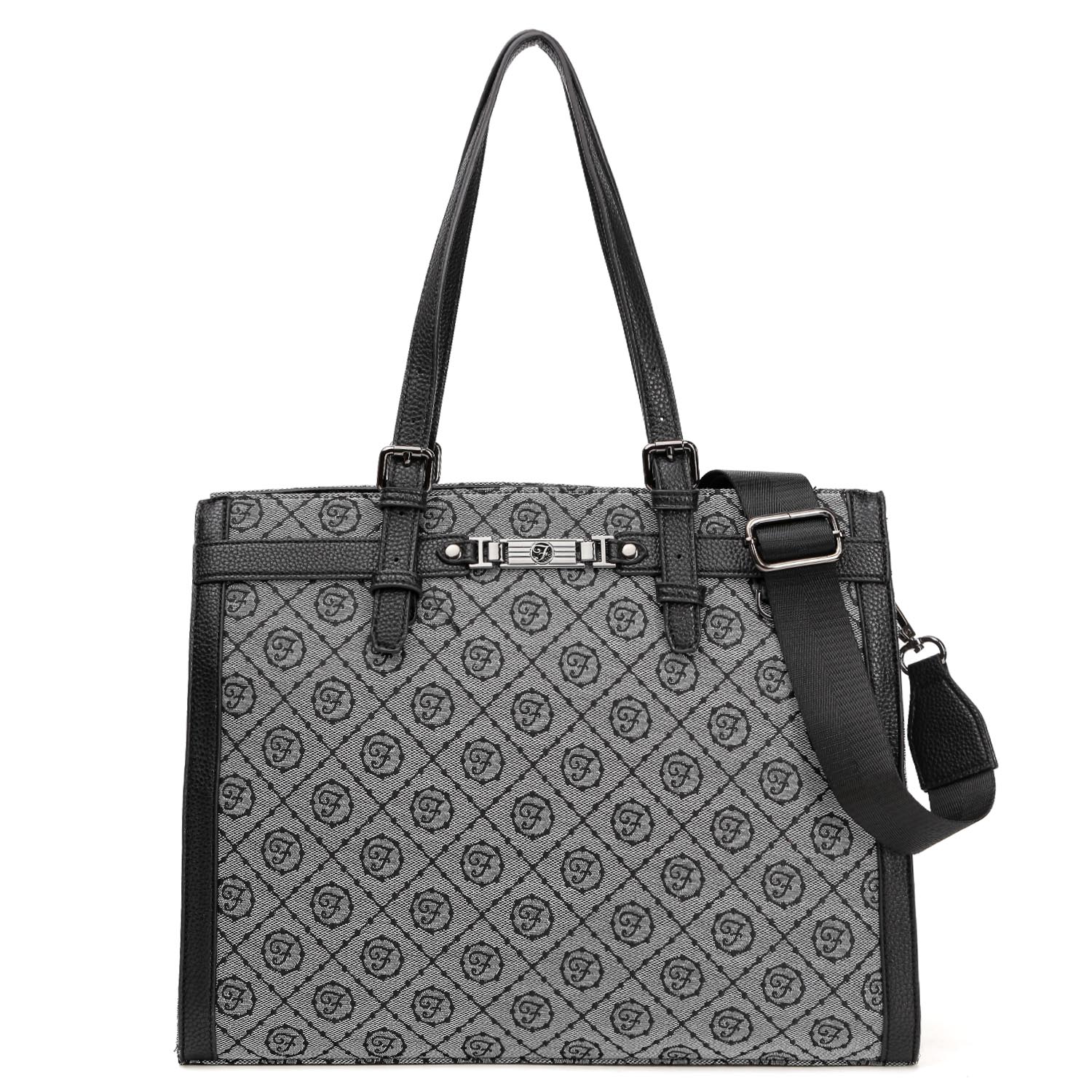 Вместительная сумка-тоут FABRETTI в черном цвете декорирована узором в стиле «Логомания». Сумка выполнена из высокотехнологичного полиэстера с фактурой гобелен, устойчивого к воздействию влаги и перепаду температур. Ручки и детали отделки – из экокожи. Сумка закрывается на молнию. Внутри есть 3 кармана для мелочей: 2 открытых и на молнии. На тыльной стороне предусмотрен карман быстрого доступа на молнии. Текстильный плечевой ремень съемный, регулируется по длине, ширина - 4 см. Цвет фурнитуры - черненый никель.