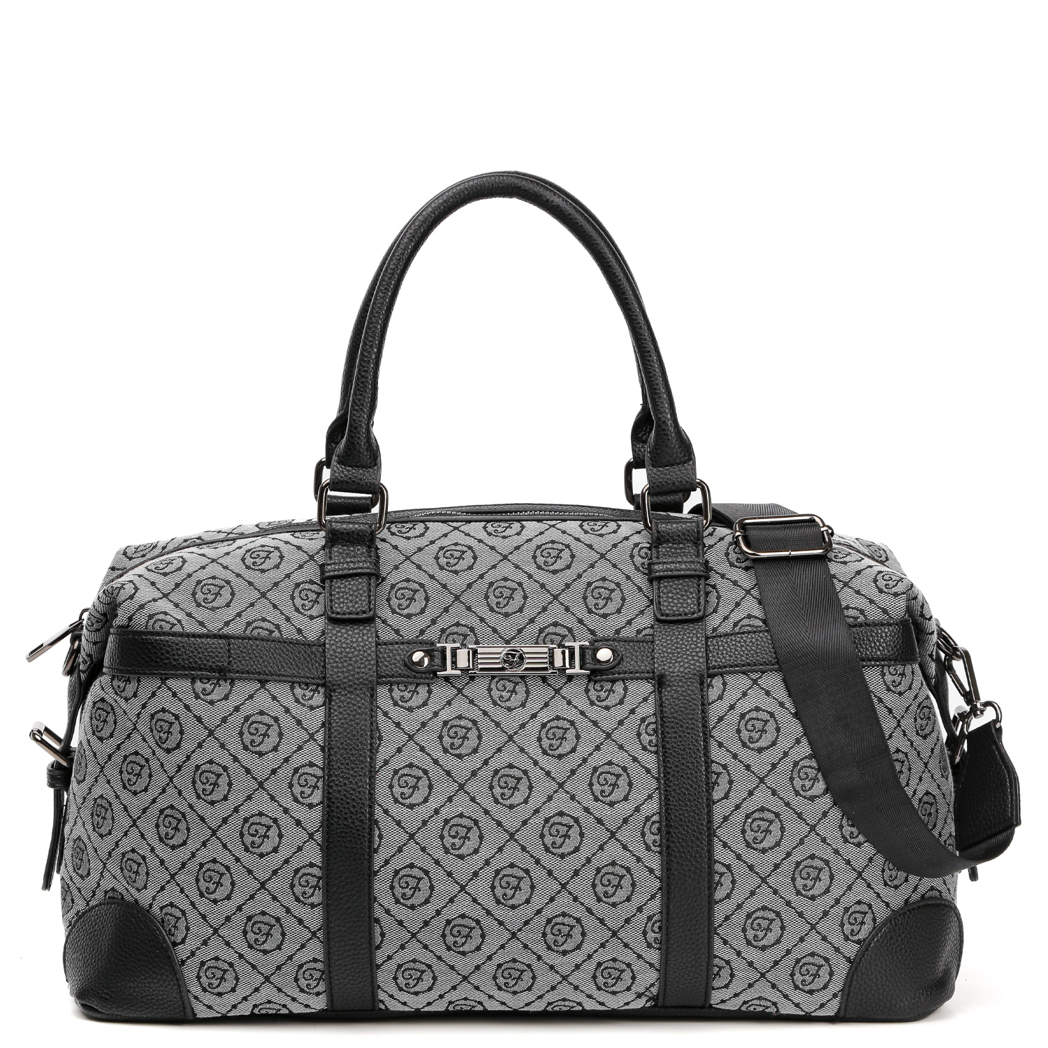 Дорожная сумка FABRETTI в черном цвете декорирована узором в стиле «Логомания». Сумка выполнена из высокотехнологичного полиэстера с фактурой гобелен, устойчивого к воздействию влаги и перепаду температур. Ручки и элементы отделки выполнены из экокожи. Просторное отделение закрывается на молнию. Внутри 3 боковых кармана для мелочей: 2 открытых и на молнии. На тыльной стороне расположен открытый карман быстрого доступа. В комплект входит съемный плечевой ремень, длина которого регулируется, ширина - 3,5 см. Цвет фурнитуры - черненый никель.