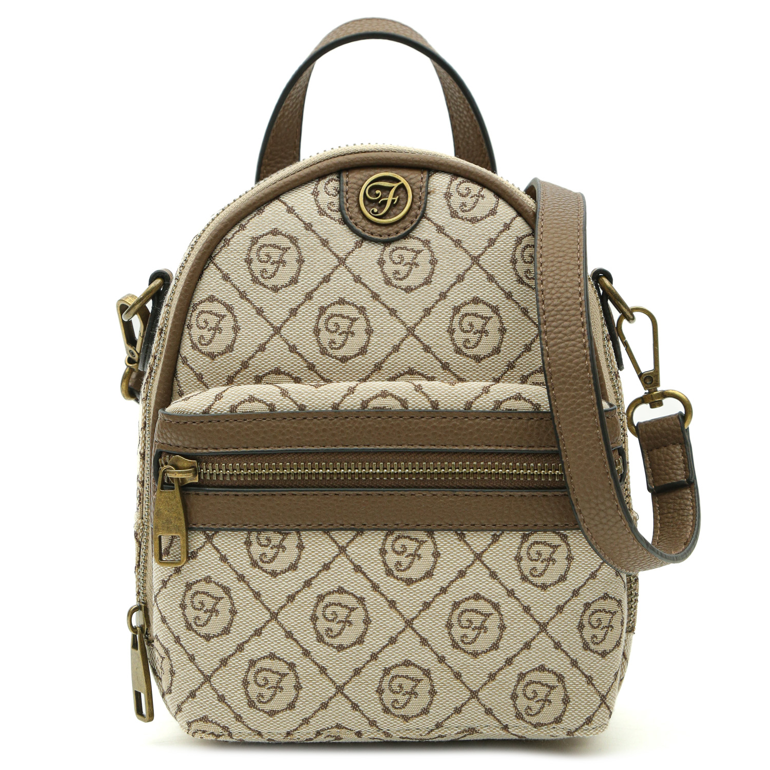 Компактная сумка через плечо FABRETTI в коричневом оттенке декорирована узором в стиле «Логомания». Сумка выполнена из высокотехнологичного полиэстера с фактурой гобелен, устойчивого к воздействию влаги и перепаду температур. Плечевой ремень и детали отделки – из экокожи. Модель в виде рюкзачка закрывается на полукруглую молнию с металлическим поводком. Внутри 2 кармана для мелочей: открытый и на молнии. На лицевой стороне расположен вместительный накладной карман на молнии. Сверху предусмотрена ручка. Съемный плечевой ремень регулируется по длине, ширина - 1,5 см. Цвет фурнитуры – бронза.
