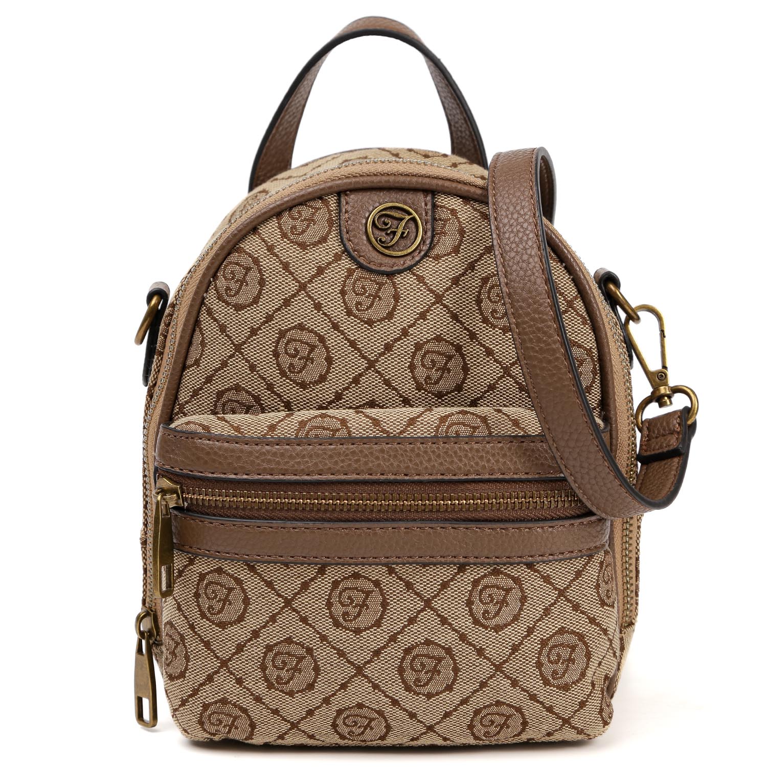 Компактная сумка через плечо FABRETTI в темно-коричневом оттенке декорирована узором в стиле «Логомания». Сумка выполнена из высокотехнологичного полиэстера с фактурой гобелен, устойчивого к воздействию влаги и перепаду температур. Плечевой ремень и детали отделки – из экокожи. Модель в виде рюкзачка закрывается на полукруглую молнию с металлическим поводком. Внутри 2 кармана для мелочей: открытый и на молнии. На лицевой стороне расположен вместительный накладной карман на молнии. Сверху предусмотрена ручка. Съемный плечевой ремень регулируется по длине, ширина - 1,5 см. Цвет фурнитуры – бронза.