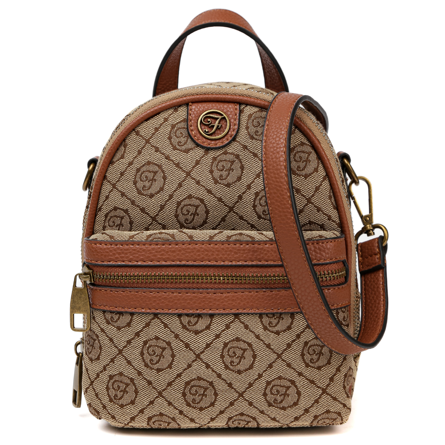 Компактная сумка через плечо FABRETTI в коричневом оттенке декорирована узором в стиле «Логомания». Сумка выполнена из высокотехнологичного полиэстера с фактурой гобелен, устойчивого к воздействию влаги и перепаду температур. Плечевой ремень и детали отделки – из экокожи. Модель в виде рюкзачка закрывается на полукруглую молнию с металлическим поводком. Внутри 2 кармана для мелочей: открытый и на молнии. На лицевой стороне расположен вместительный накладной карман на молнии. Сверху предусмотрена ручка. Съемный плечевой ремень регулируется по длине, ширина - 1,5 см. Цвет фурнитуры – бронза.
