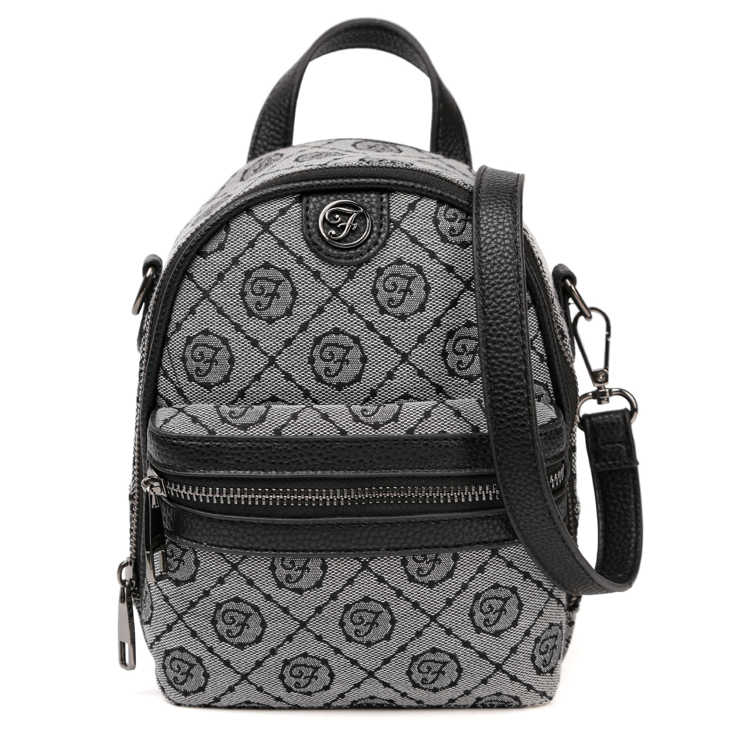 Компактная сумка через плечо FABRETTI в черном цвете декорирована узором в стиле «Логомания». Сумка выполнена из высокотехнологичного полиэстера с фактурой гобелен, устойчивого к воздействию влаги и перепаду температур. Плечевой ремень и детали отделки – из экокожи. Модель в виде рюкзачка закрывается на полукруглую молнию с металлическим поводком. Внутри 2 кармана для мелочей: открытый и на молнии. На лицевой стороне расположен вместительный накладной карман на молнии. Сверху предусмотрена ручка. Съемный плечевой ремень регулируется по длине, ширина - 1,5 см. Цвет фурнитуры – черненый никель.