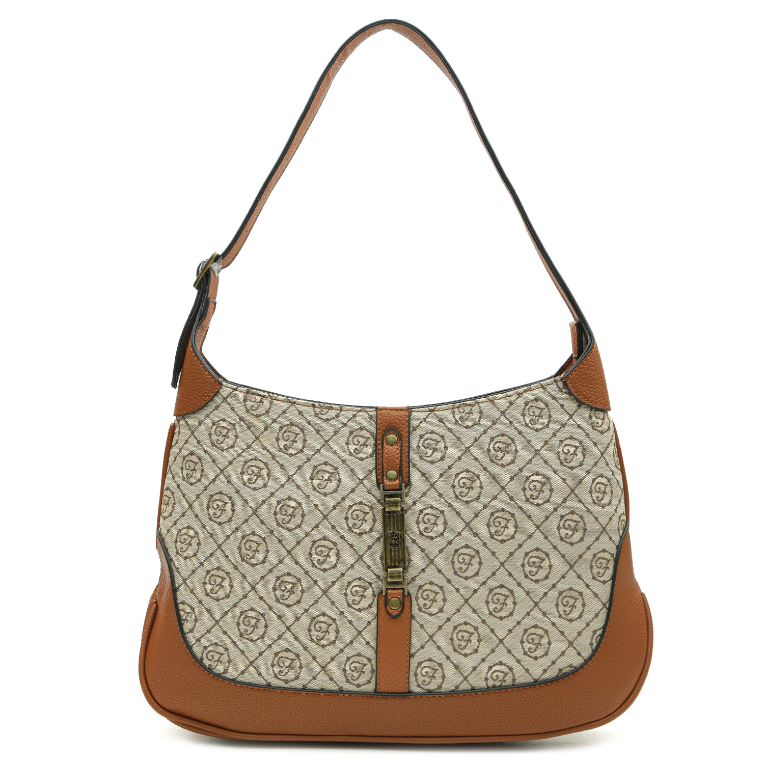 Оригинальная сумка на плечо FABRETTI в светло-коричневом оттенке декорирована узором в стиле «Логомания». Сумка выполнена из высокотехнологичного полиэстера с фактурой гобелен, устойчивого к воздействию влаги и перепаду температур. Плечевой ремень и детали отделки – из экокожи. Основное отделение закрывается на молнию с металлическим поводком. Внутри 3 кармана для мелочей: 2 открытых и на молнии. На тыльной стороне расположен карман быстрого доступа на молнии. Плечевой ремень регулируется по длине, ширина - 3 см. Цвет фурнитуры - бронза.