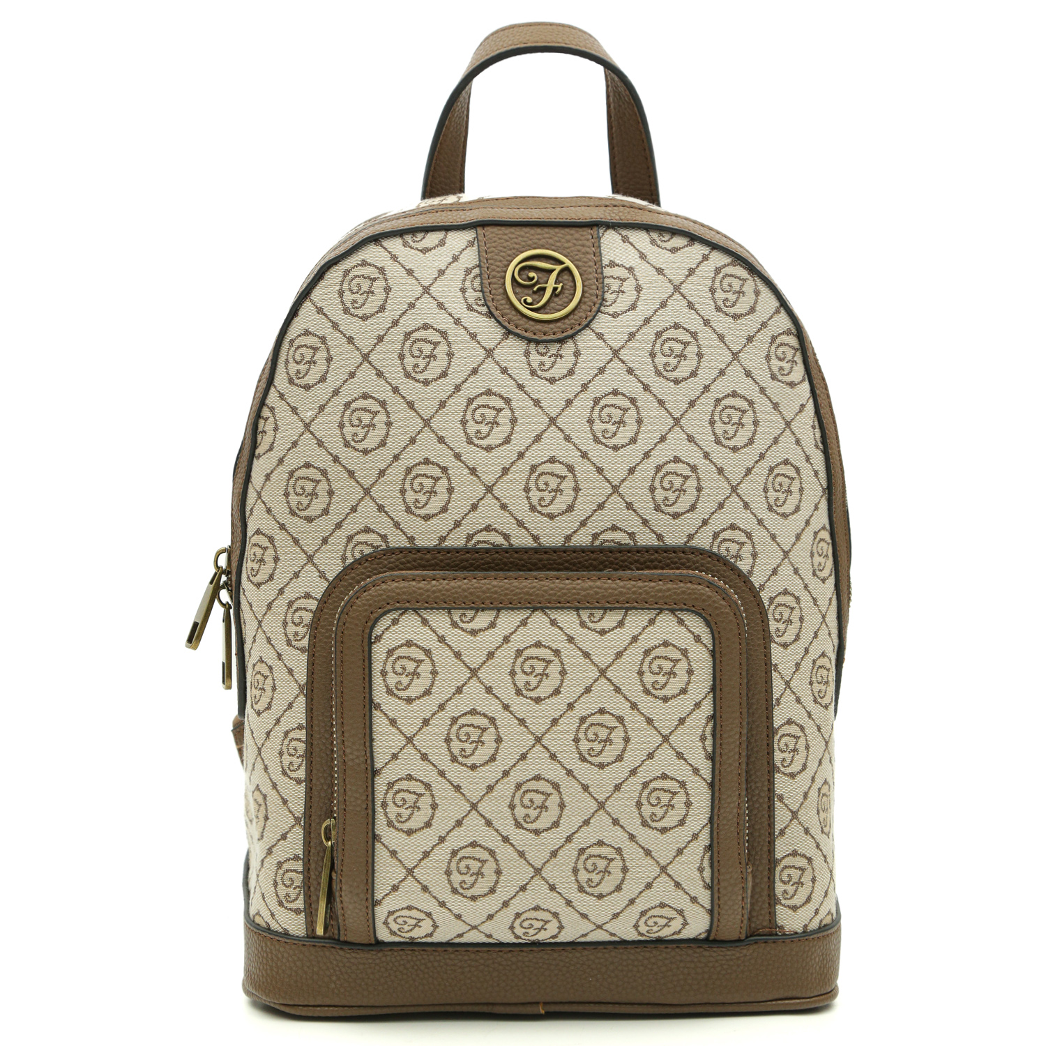 Стильный рюкзак FABRETTI в коричневом оттенке декорирован узором в стиле «Логомания». Рюкзак выполнен из высокотехнологичного полиэстера с фактурой гобелен, устойчивого к воздействию влаги и перепаду температур. Аксессуар закрывается на полукруглую молнию с 2 бегунками. Внутри 3 кармана для мелочей: 2 открытых и на молнии. На лицевой стороне расположен накладной карман на полукруглую молнию. На тыльной стороне есть вертикальный карман быстрого доступа. Сверху есть ручка. 2 лямки регулируются по длине, ширина - 4,5 см. Цвет фурнитуры - бронза.