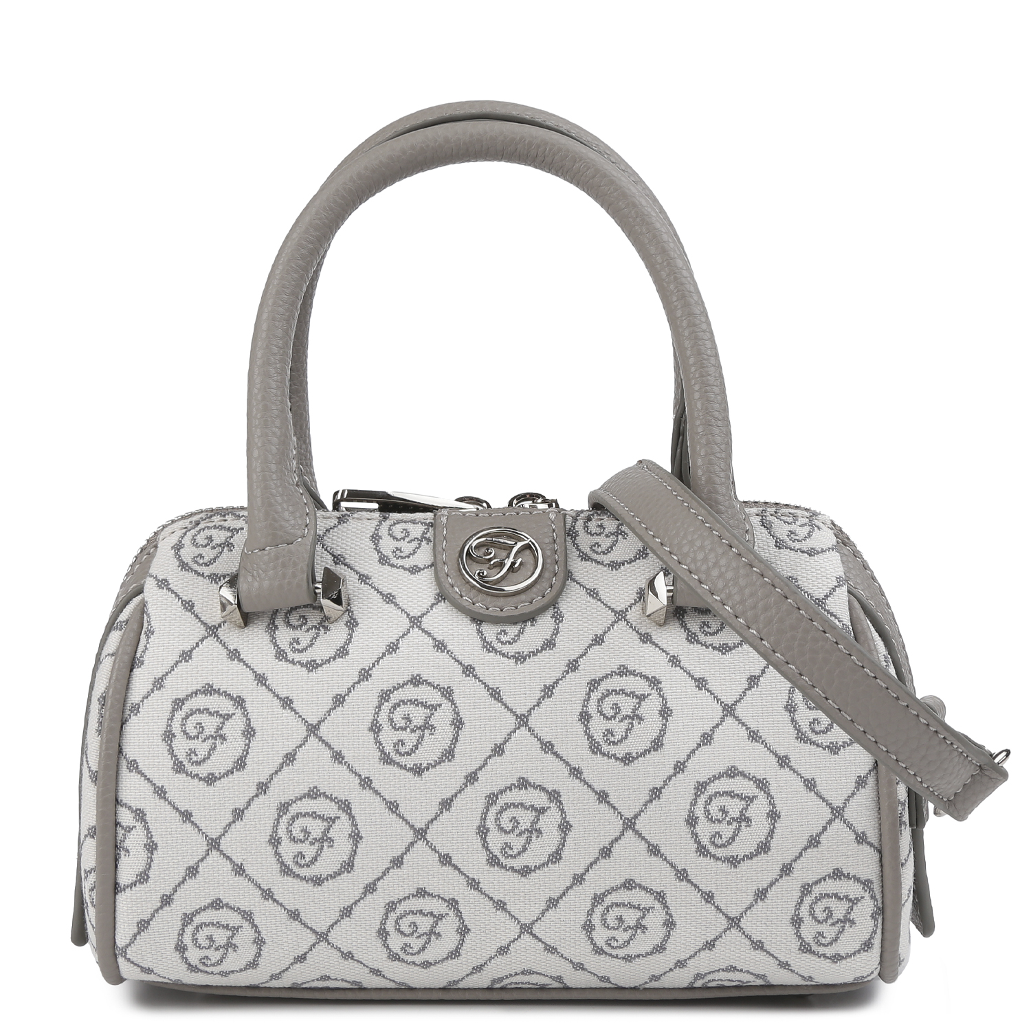 Компактная женская сумка итальянского бренда FABRETTI в светло-сером оттенке с серой отделкой декорирована узором в стиле «Логомания». Сумка выполнена из высокотехнологичного полиэстера с фактурой гобелен, устойчивого к воздействию влаги и перепаду температур. Ручки и элементы отделки выполнены из экокожи. Основное отделение закрывается на полукруглую молнию. Внутри 2 боковых кармана для мелочей: открытый и на молнии. В комплект входит съемный плечевой ремень из экокожи, длина которого регулируется, ширина – 1,5 см. Цвет фурнитуры - серебро.