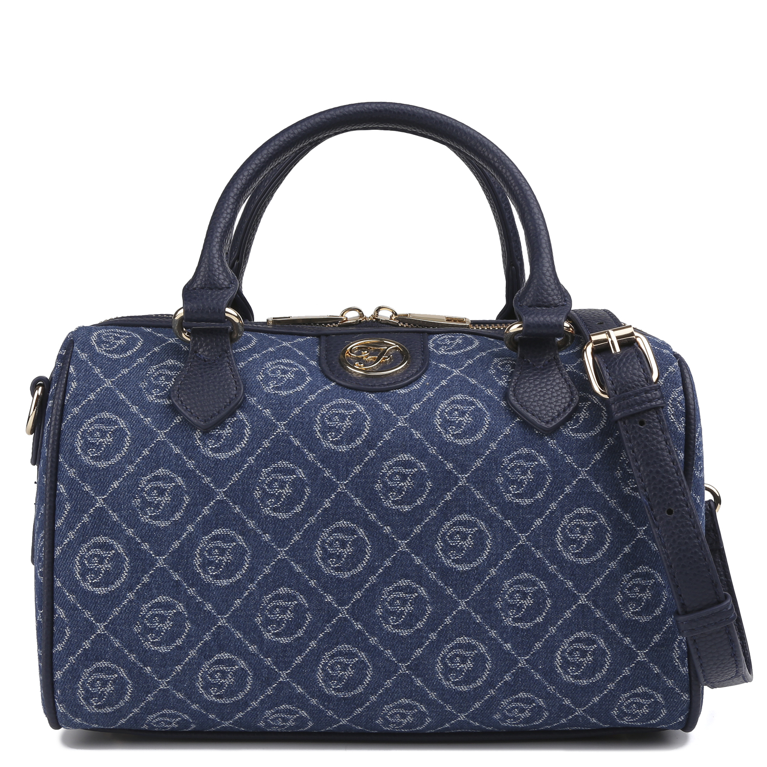 Удобная женская сумка-сэтчел итальянского бренда FABRETTI в синем оттенке с темно-синей отделкой декорирована узором в стиле «Логомания». Сумка выполнена из высокотехнологичного полиэстера с фактурой гобелен, устойчивого к воздействию влаги и перепаду температур. Ручки и элементы отделки выполнены из экокожи. Основное отделение закрывается на полукруглую молнию. Внутри 2 боковых кармана для мелочей: открытый и на молнии. На тыльной стороне расположен карман быстрого доступа на молнии. В комплект входит съемный плечевой ремень из экокожи, длина которого регулируется, ширина - 2 см. Цвет фурнитуры - золото.