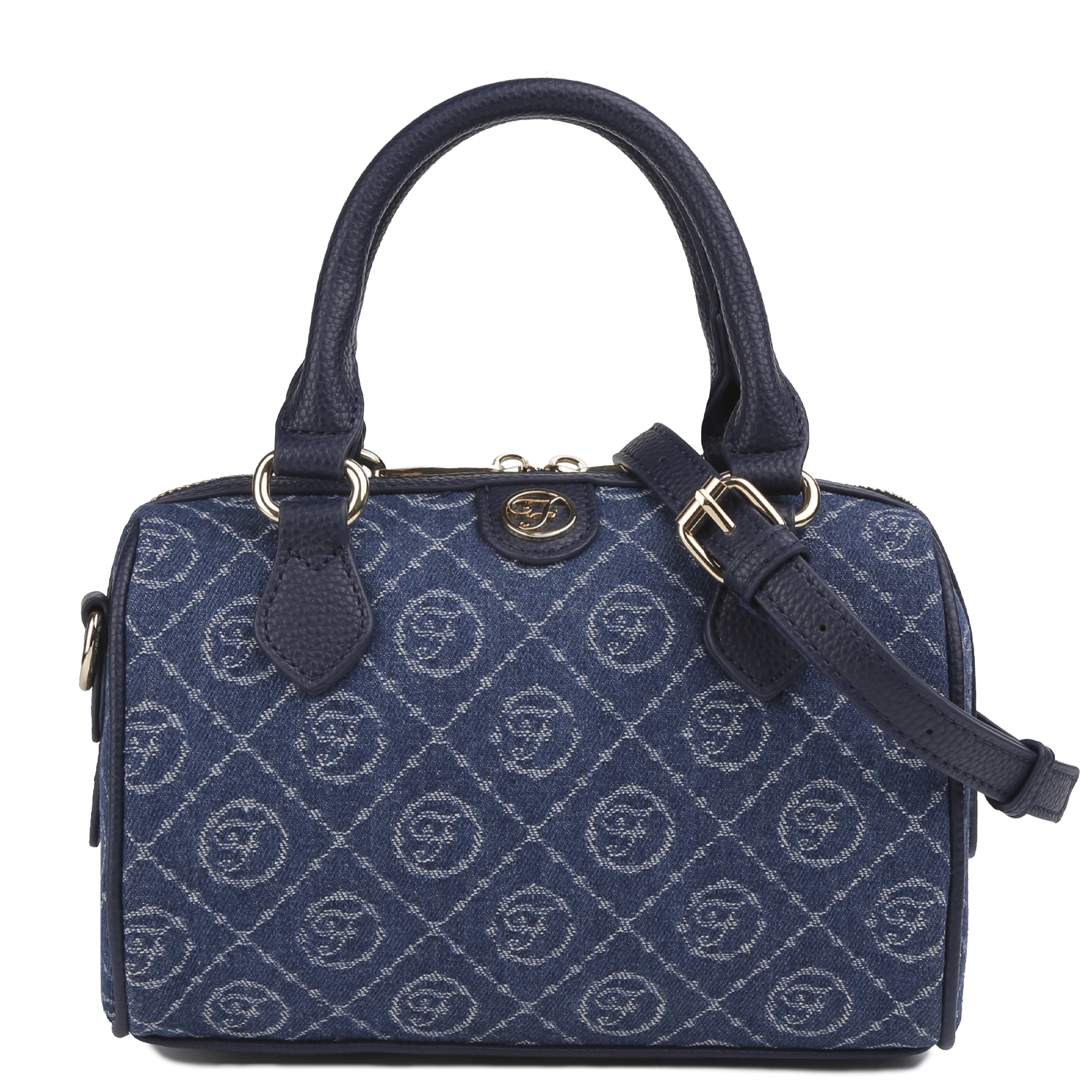 Миниатюрная женская сумка кросс-боди итальянского бренда FABRETTI в синем оттенке с темно-синей отделкой декорирована узором в стиле «Логомания». Сумка выполнена из высокотехнологичного полиэстера с фактурой гобелен, устойчивого к воздействию влаги и перепаду температур. Ручки и элементы отделки выполнены из экокожи. Основное отделение закрывается на полукруглую молнию. Внутри 2 боковых кармана для мелочей: открытый и на молнии. На тыльной стороне расположен карман быстрого доступа на молнии. В комплект входит съемный плечевой ремень из экокожи, длина которого регулируется, ширина – 1,5 см. Цвет фурнитуры - золото.