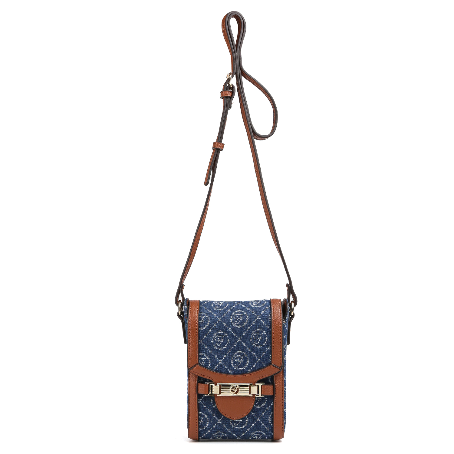Компактная женская сумка кросс-боди итальянского бренда FABRETTI в синем оттенке с коричневой отделкой декорирована узором в стиле «Логомания». Сумка выполнена из высокотехнологичного полиэстера с фактурой гобелен, устойчивого к воздействию влаги и перепаду температур. Ремень и элементы отделки выполнены из экокожи. Основное отделение закрывается клапаном с магнитом. Внутри 3 открытых кармана для карт.