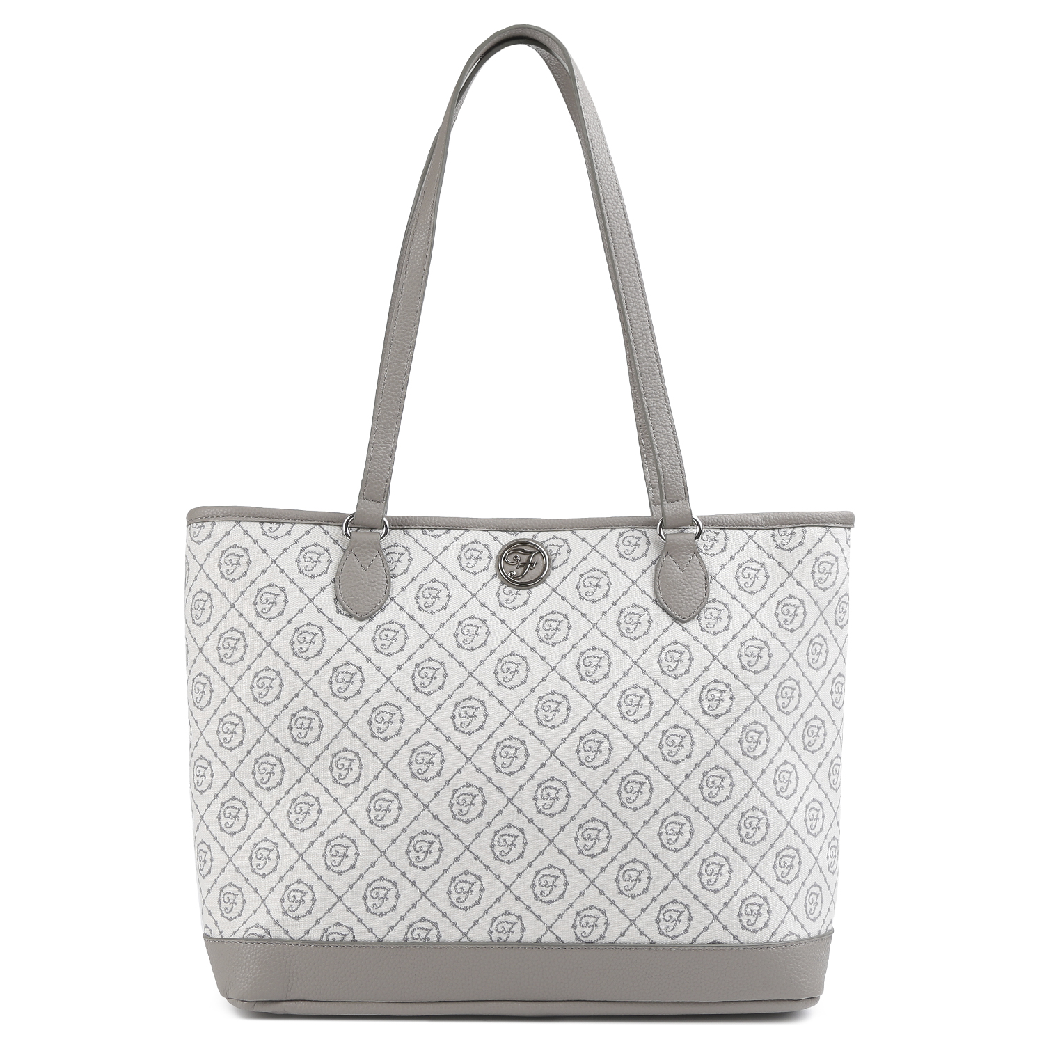 Вместительная женская сумка-тоут итальянского бренда FABRETTI в светло-сером оттенке с серой отделкой декорирована узором в стиле «Логомания». Сумка выполнена из высокотехнологичного полиэстера с фактурой гобелен, устойчивого к воздействию влаги и перепаду температур. Ручки и элементы отделки выполнены из экокожи. Основное отделение закрывается на полукруглую молнию. Внутри две больших секции, разделенные карманом на молнии. По бокам сделаны два открытых кармана и один карман на молнии. Лицевая сторона украшена металлическим логотипом. На тыльной стороне карман быстрого доступа на молнии. Цвет фурнитуры - серебро.