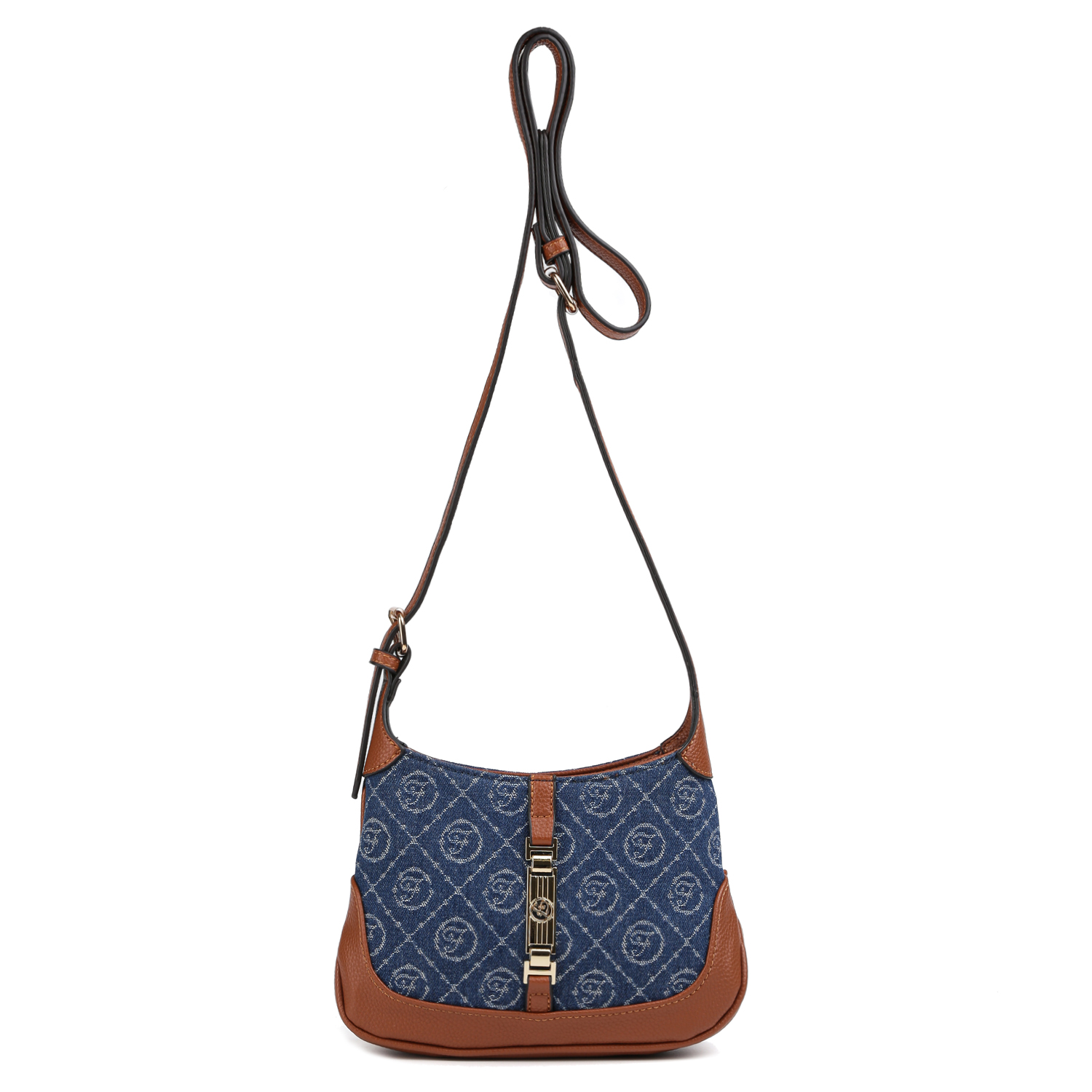 Миниатюрная женская сумка итальянского бренда FABRETTI в синем цвете с коричневой отделкой декорирована узором в стиле "Логомания".