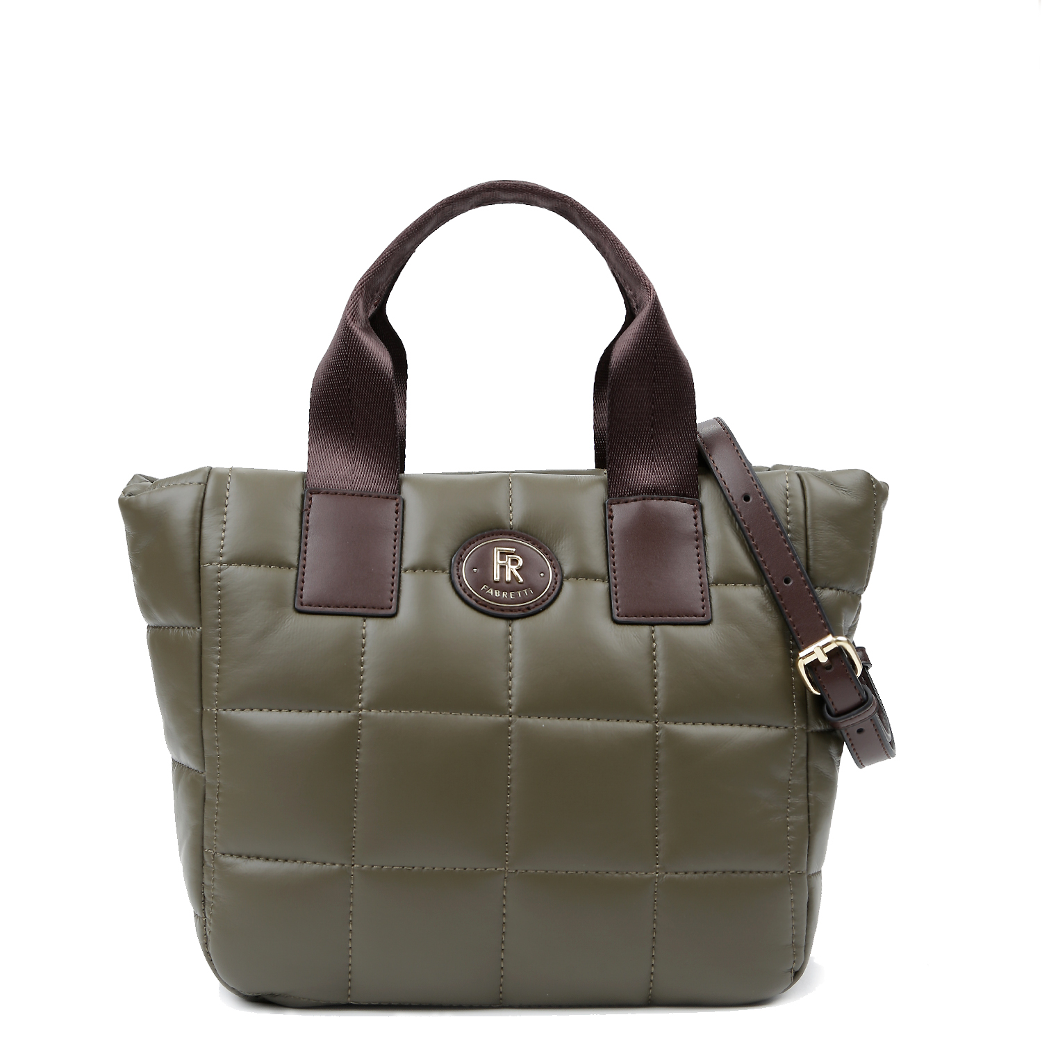 Женская стеганая дутая сумка-тоут  итальянского бренда FABRETTI выполнена из высокотехнологичного полиэстера, устойчивого к влаге и перепадам температур, в оттенке хаки с отделкой из экокожи коричневого цвета. Основное отделение закрывается на молнию. Внутри расположены открытый карман и карман на молнии. Модель оснащена двумя ручками длиной 44 см и съёмным регулируемым ремнём длиной 122–137 см и шириной 1,4 см. Цвет фурнитуры — золото. Стильная фактура и тёплый оттенок делают сумку выразительным акцентом в повседневном образе.