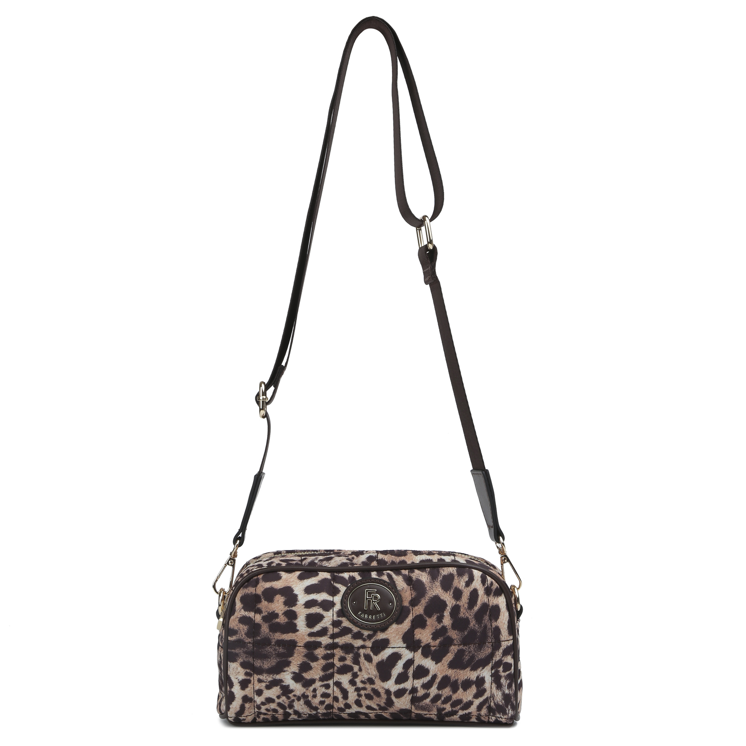 Компактная кросс-боди FABRETTI с леопардовым принтом выполнена из высокотехнологичной ткани, которая устойчива к воздействию влаги и перепаду температур. Основное отделение закрывается на молнию. Внутри 2 боковых кармана для мелочей: открытый и на молнии. Съемный плечевой ремень, регулируемый по длине, ширина - 4 см. Цвет фурнитуры - золото.