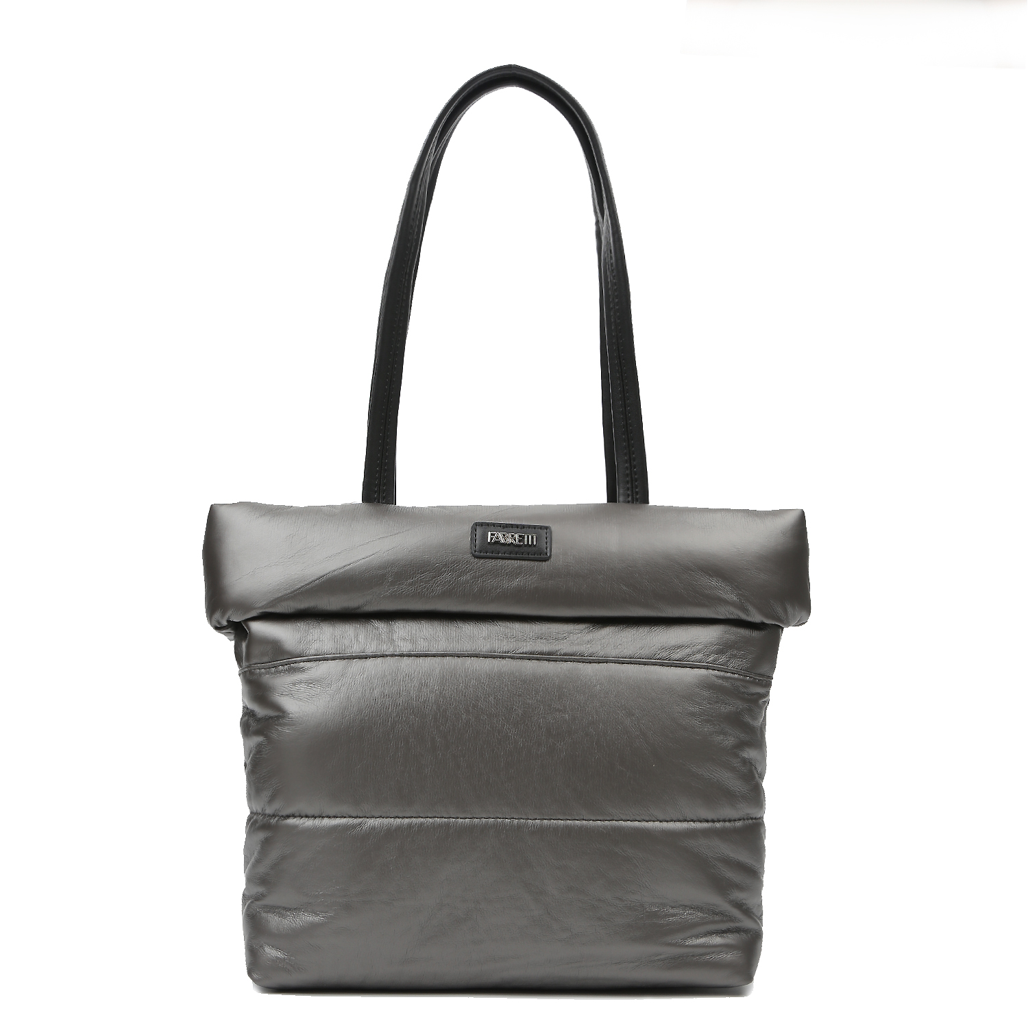 Стеганая сумка тоут среднего размера итальянского бренда FABRETTI выполнена из экокожи в оттенке серый металлик с контрастной отделкой чёрного цвета. Модель оснащена двумя ручками длиной 63 см, удобными для ношения на плече. Основное отделение закрывается на молнию. Внутри расположены открытый карман и карман на молнии. На тыльной стороне — карман быстрого доступа. Цвет фурнитуры — серебро.