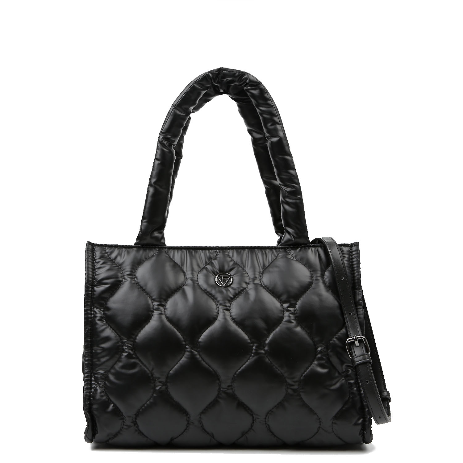Стеганая сумка тоут среднего размера итальянского бренда FABRETTI выполнена из экокожи чёрного оттенка. Модель оснащена двумя ручками длиной 48 см, а также съёмным регулируемым ремешком длиной 113–133 см и шириной 1,8 см. Основное отделение закрывается на молнию. Внутри — открытый карман и карман на молнии. Цвет фурнитуры — серебро. Практичная и эффектная модель, идеально сочетается с верхней одеждой в холодное время года.