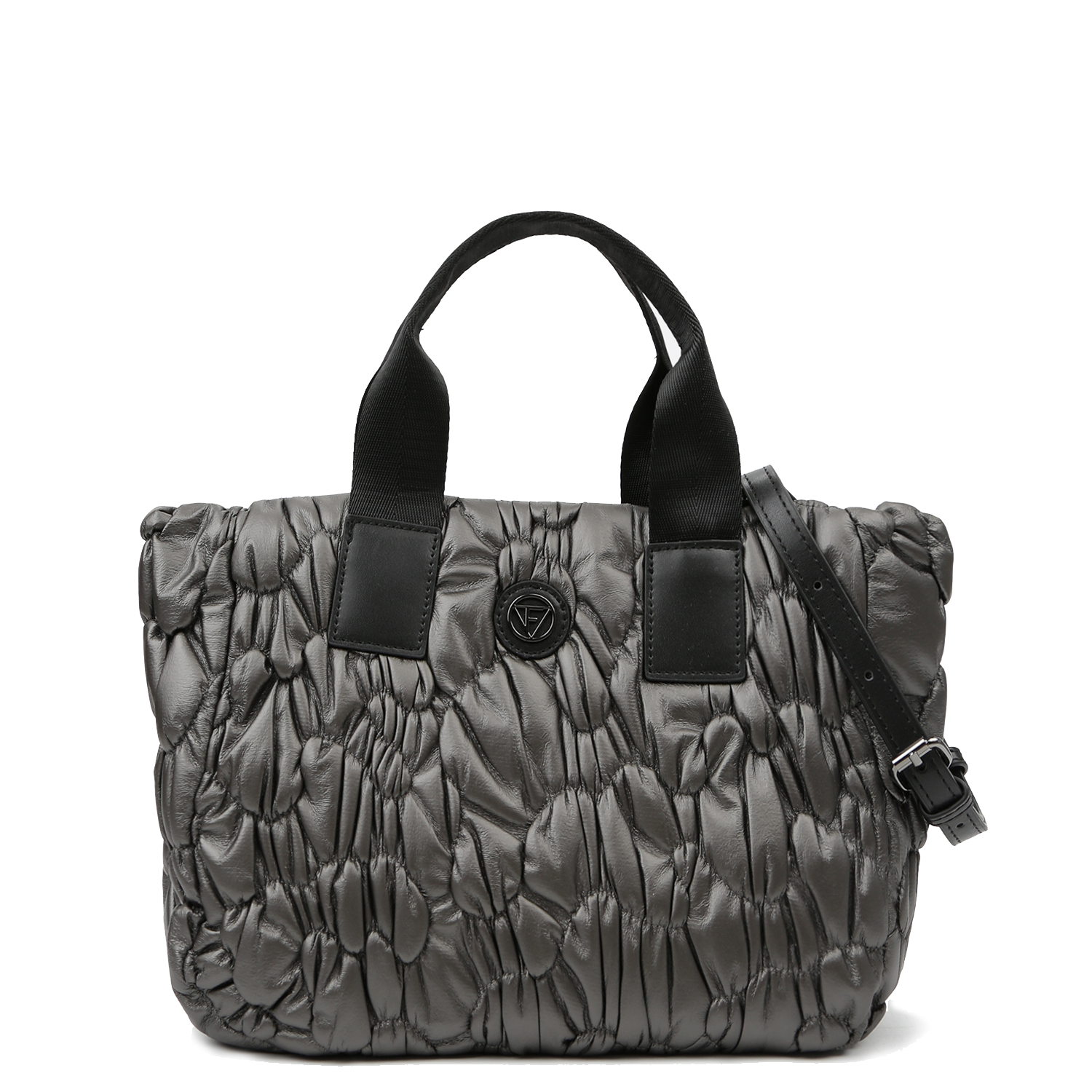 Женская стеганая дутая сумка-тоут среднего размера итальянского бренда FABRETTI выполнена из высокотехнологичного полиэстера, устойчивого к влаге и перепадам температур, в оттенке тёмно-серый металлик с отделкой из экокожи чёрного цвета. Фактура — абстрактная стежка с элементами драпировки. Основное отделение закрывается на молнию. Внутри расположены открытый карман и карман на молнии. Модель оснащена двумя ручками длиной 43 см и съёмным регулируемым ремнём длиной 122–137 см и шириной 1,4 см. Цвет фурнитуры — серебро. Лаконичный дизайн дополнен фактурной поверхностью для создания стильных городских образов.