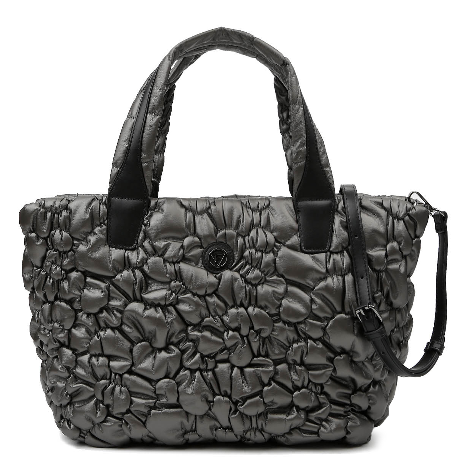 Женская стеганая дутая сумка-тоут среднего размера итальянского бренда FABRETTI выполнена из высокотехнологичного полиэстера, устойчивого к влаге и перепадам температур, в оттенке тёмно-серый металлик с отделкой из экокожи чёрного цвета. Фактура — абстрактная стежка с элементами драпировки. Основное отделение закрывается на молнию. Внутри расположены открытый карман и карман на молнии. Модель оснащена двумя ручками длиной 52 см и съёмным регулируемым ремнём длиной 123–138 см и шириной 1,4 см. Цвет фурнитуры — серебро. Эффектный металлизированный оттенок придаёт модели динамичность и современный характер.
