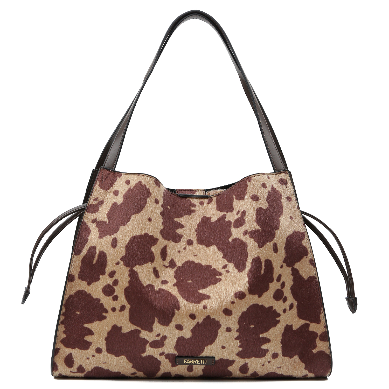 Сумка с ручками на плечо итальянского бренда FABRETTI выполнена из экокожи с фактурой под шкуру коровы (cow print) в темно-бежевом оттенке.  По верхнему краю расположены кулиски из экокожи, с помощью которых можно утянуть верх и скрыть содержимое. Внутри сумки расположено несъемное отделение  с таким же принтом. Внутри — один открытый карман и один карман на молнии. Модель сумки удобно носить на плече благодаря двум длинным ручкам, длиной 55 см и шириной 1,6 см. Цвет фурнитуры — золото.