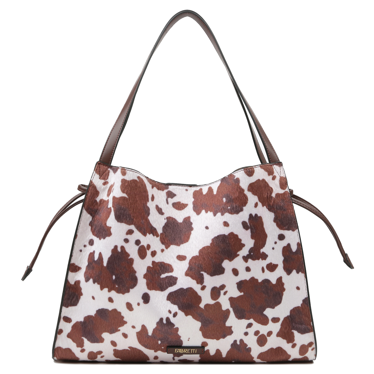 Сумка с ручками на плечо итальянского бренда FABRETTI выполнена из экокожи с фактурой под шкуру коровы (cow print) в темно-бежевом оттенке. По верхнему краю расположены кулиски из экокожи, с помощью которых можно утянуть верх и скрыть содержимое. Внутри сумки расположено несъемное отделение  с таким же принтом. Внутри — один открытый карман и один карман на молнии. Модель сумки удобно носить на плече благодаря двум длинным ручкам, длиной 55 см и шириной 1,6 см. Цвет фурнитуры — золото.