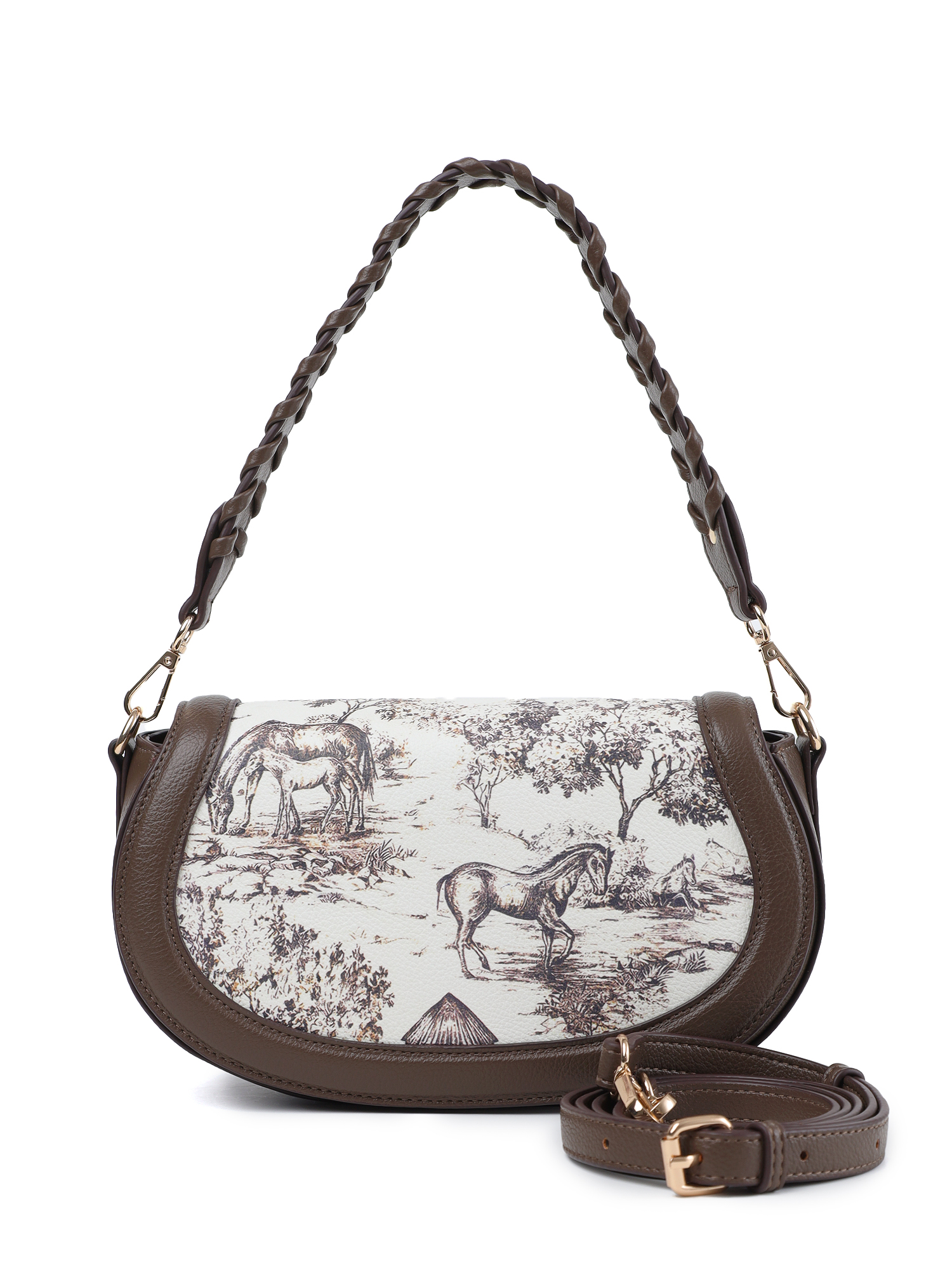 Основное отделение закрывается на молнию, внутри открытый карман и на молнии. Поверхность украшена стилизованным принтом в виде сельского пейзажа с лошадьми и колодцем.