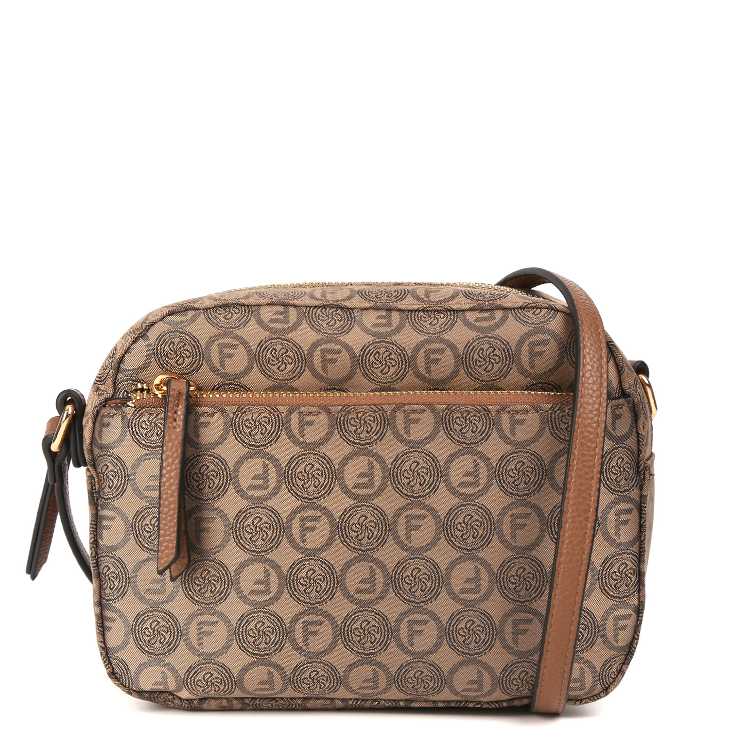 Компактная кросс-боди FABRETTI в коричневом оттенке декорирована узором в стиле "Логомания". Материал сумки состоит из двух слоев: нижний слой из экокожи, верхний - из жаккарда. Двухслойный материал - это текстильное волокно, дублированное с высококачественным полиуретаном посредством термической обработки. Основное отделение закрывается на полукруглую молнию. Внутри 2 боковых кармана для мелочей: открытый и на молнии. На лицевой стороне расположен карман быстрого доступа на молнии. Плечевой ремень регулируется по длине, ширина - 1 см. Цвет фурнитуры - золото.