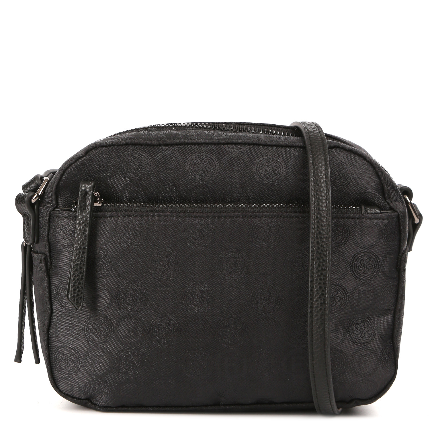 Компактная кросс-боди FABRETTI в черном цвете декорирована узором в стиле "Логомания". Материал сумки состоит из двух слоев: нижний слой из экокожи, верхний - из жаккарда. Двухслойный материал - это текстильное волокно, дублированное с высококачественным полиуретаном посредством термической обработки. Основное отделение закрывается на полукруглую молнию. Внутри 2 боковых кармана для мелочей: открытый и на молнии. На лицевой стороне расположен карман быстрого доступа на молнии. Плечевой ремень регулируется по длине, ширина - 1 см. Цвет фурнитуры - черненый никель.