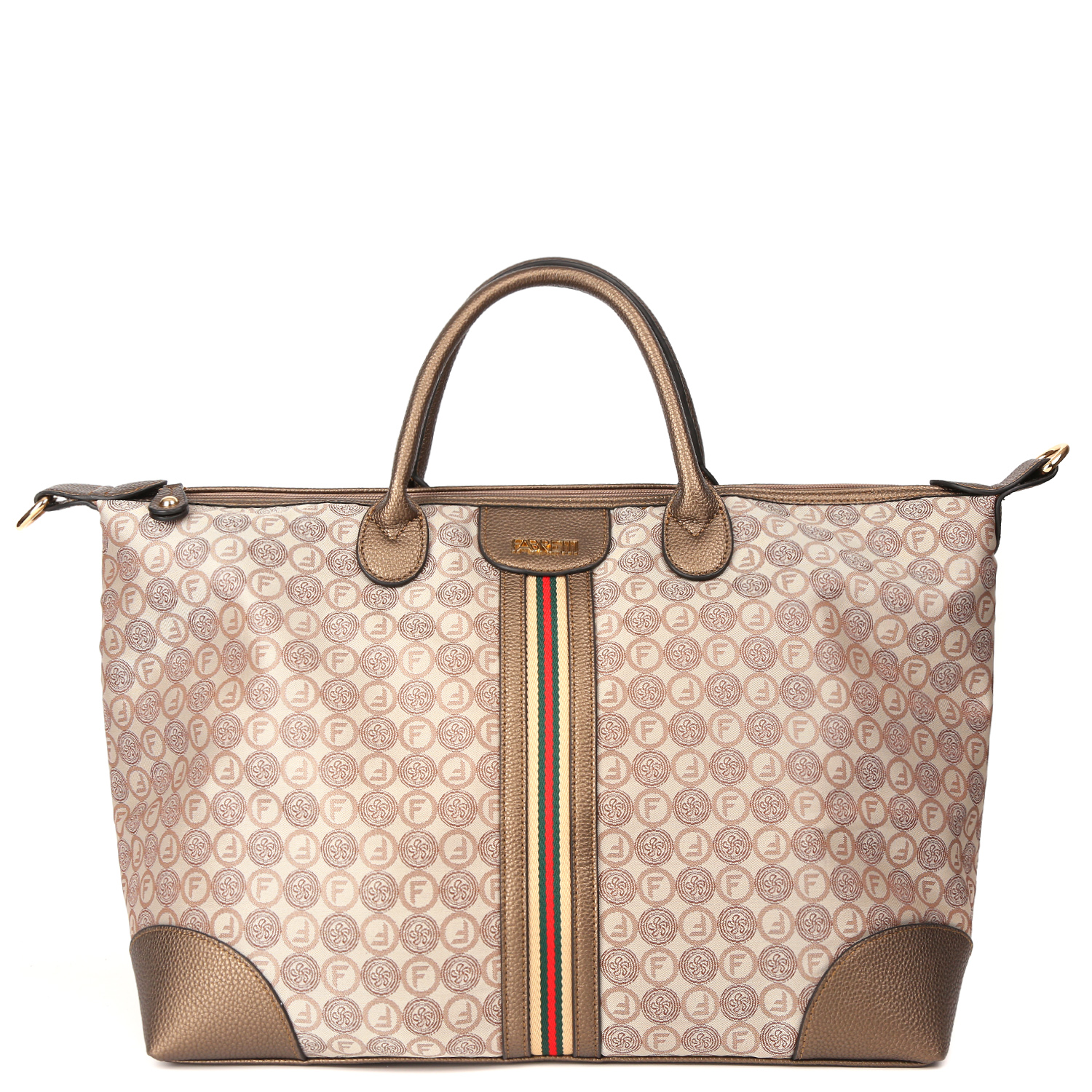 Вместительная дорожная сумка FABRETTI в бежевом оттенке декорирована узором в стиле «Логомания». Сумка выполнена из высокотехнологичного полиэстера с текстурой жаккард, устойчивого к воздействию влаги и перепаду температур.  Сумка отлично подойдет для поездки на выходные и вместит самые необходимые вещи для короткого путешествия. Просторное отделение закрывается на молнию. Внутри 3 боковых кармана для мелочей: 2 открытых и на молнии. Лицевая сторона украшена контрастной текстильной лентой. На тыльной стороне расположен карман быстрого доступа на молнии. Ручки, дно и другие элементы отделки выполнены из экокожи. В комплект входит съемный плечевой ремень, длина которого регулируется, ширина - 4 см. Цвет фурнитуры - золото.
