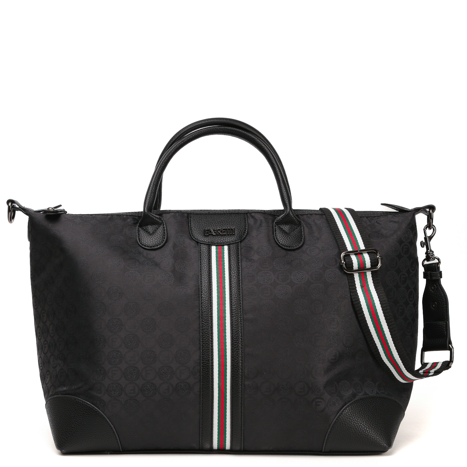 Вместительная дорожная сумка FABRETTI в черном цвете декорирована узором в стиле «Логомания». Сумка выполнена из высокотехнологичного полиэстера с текстурой жаккард, устойчивого к воздействию влаги и перепаду температур.  Сумка отлично подойдет для поездки на выходные и вместит самые необходимые вещи для короткого путешествия. Просторное отделение закрывается на молнию. Внутри 3 боковых кармана для мелочей: 2 открытых и на молнии. Лицевая сторона украшена контрастной текстильной лентой. На тыльной стороне расположен карман быстрого доступа на молнии. Ручки, дно и другие элементы отделки выполнены из экокожи. В комплект входит съемный плечевой ремень, длина которого регулируется, ширина - 4 см. Цвет фурнитуры - черненый никель.