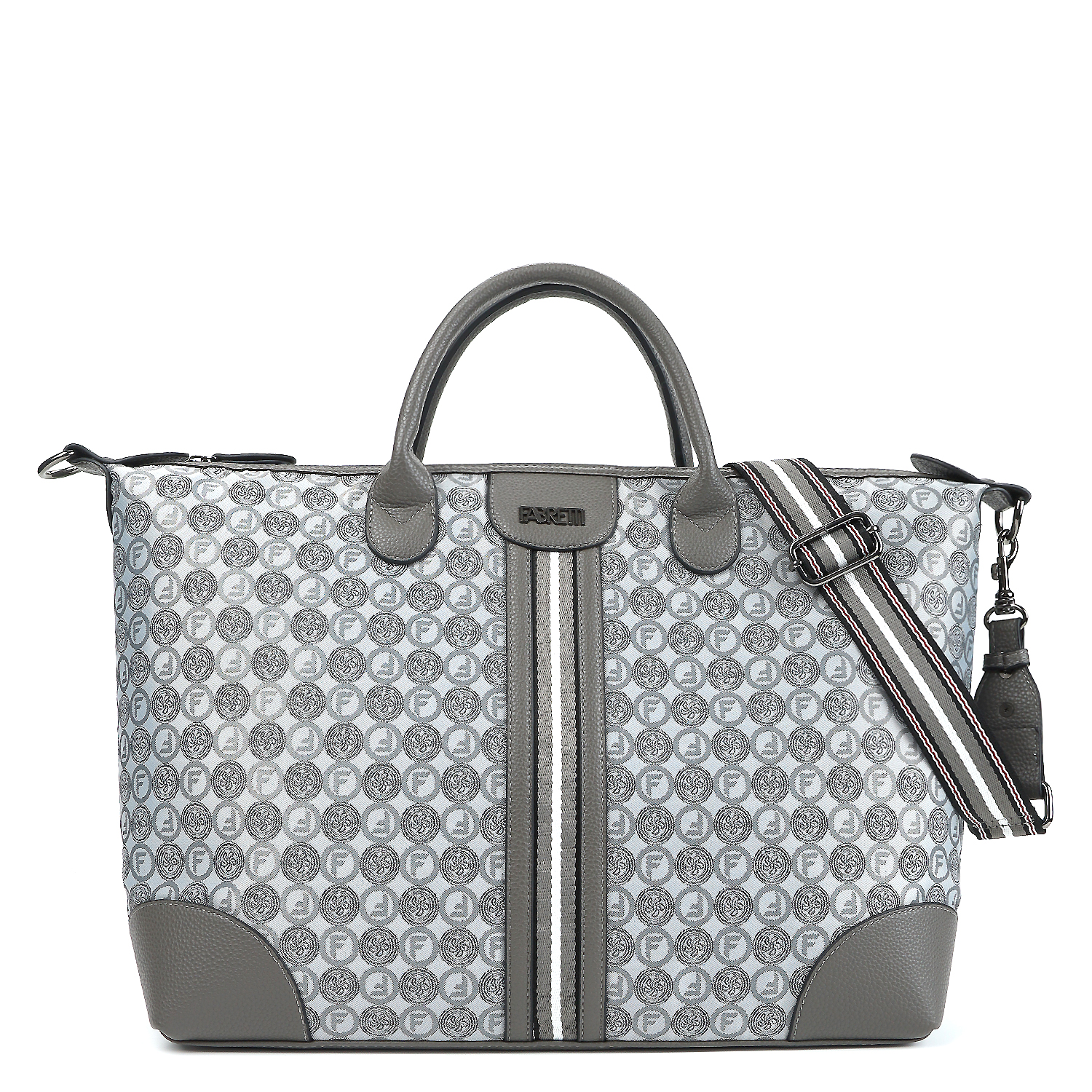 Вместительная дорожная сумка FABRETTI в сером оттенке декорирована узором в стиле «Логомания». Сумка выполнена из высокотехнологичного полиэстера с текстурой жаккард, устойчивого к воздействию влаги и перепаду температур.  Сумка отлично подойдет для поездки на выходные и вместит самые необходимые вещи для короткого путешествия. Просторное отделение закрывается на молнию. Внутри 3 боковых кармана для мелочей: 2 открытых и на молнии. Лицевая сторона украшена контрастной текстильной лентой. На тыльной стороне расположен карман быстрого доступа на молнии. Ручки, дно и другие элементы отделки выполнены из прочной экокожи. В комплект входит съемный плечевой ремень, длина которого регулируется, ширина - 4 см. Цвет фурнитуры - черный.