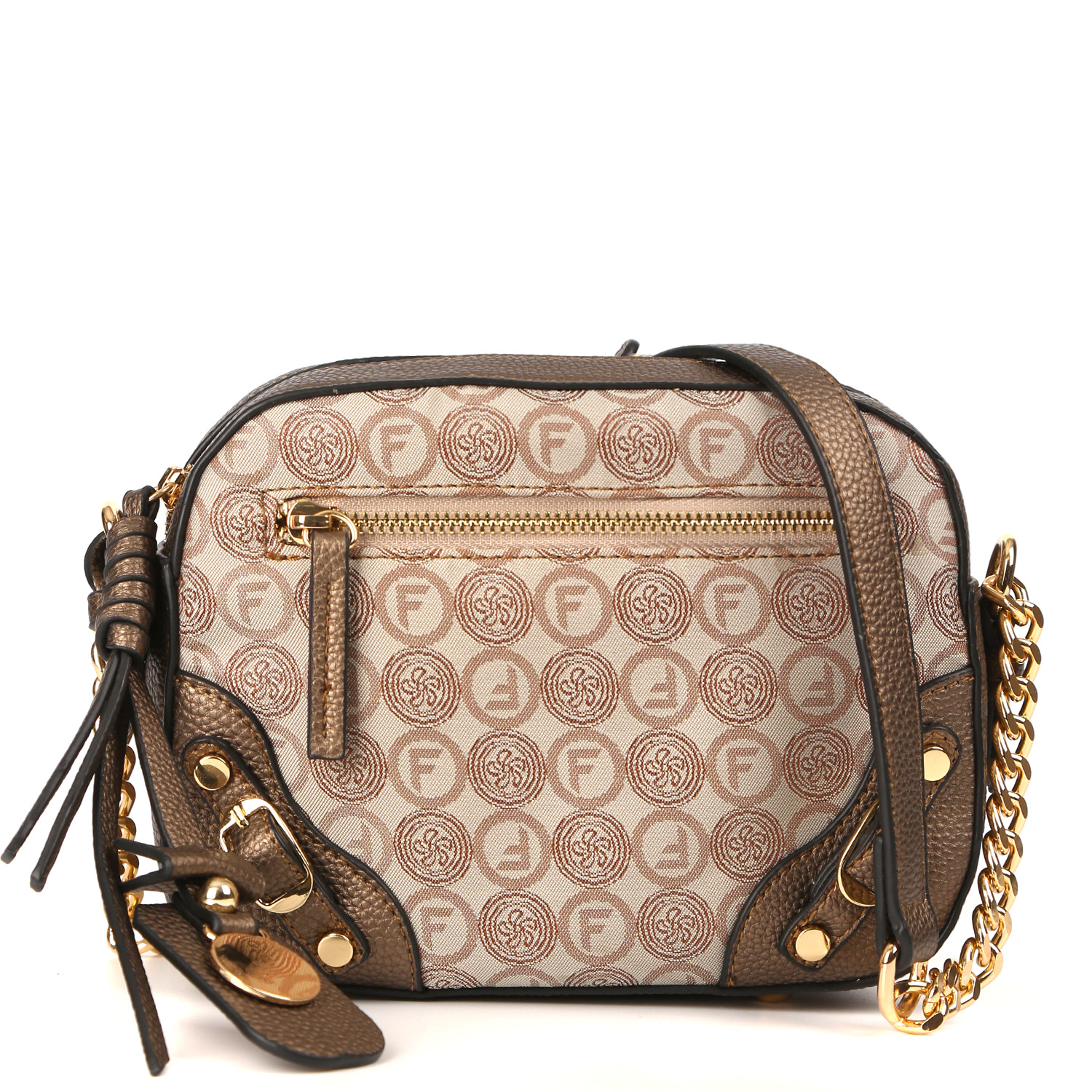 Компактная кросс-боди FABRETTI в бежевом оттенке декорирована узором в стиле "Логомания". Материал сумки состоит из двух слоев: нижний слой из экокожи, верхний - из жаккарда. Двухслойный материал - это текстильное волокно, дублированное с высококачественным полиуретаном посредством термической обработки. Основное отделение закрывается на полукруглую молнию. Внутри 2 боковых кармана для мелочей: открытый и на молнии. На лицевой стороне расположен карман быстрого доступа на молнии. Дно сумки защищают 4 металлические ножки. Плечевой ремень регулируется по длине и сочетает экокожу со вставками из металлической цепочки, ширина - 2 см. Цвет фурнитуры - золото.