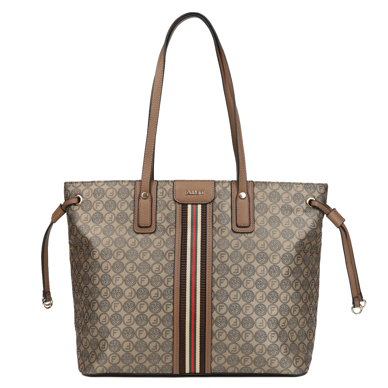 Вместительная дорожная сумка FABRETTI в коричневом оттенке декорирована узором в стиле "Логомания". Материал изделия состоит из двух слоев: нижний слой из экокожи, верхний - из жаккарда. Двухслойный материал - это текстильное волокно, дублированное с высококачественным полиуретаном посредством термической обработки. Сумка закрывается на молнию. Внутри 3 боковых кармана для мелочей: 2 открытых и на молнии. Лицевая сторона украшена контрастной текстильной лентой. На тыльной стороне расположен карман быстрого доступа на молнии. Дно сумки защищают 4 металлические ножки. Удлиненные ручки шириной 1 см позволяют комфортно носить изделие на плече или в руках. Цвет фурнитуры - золото.